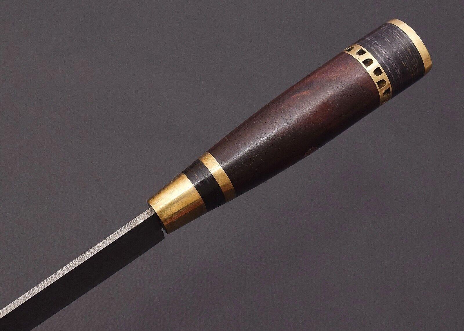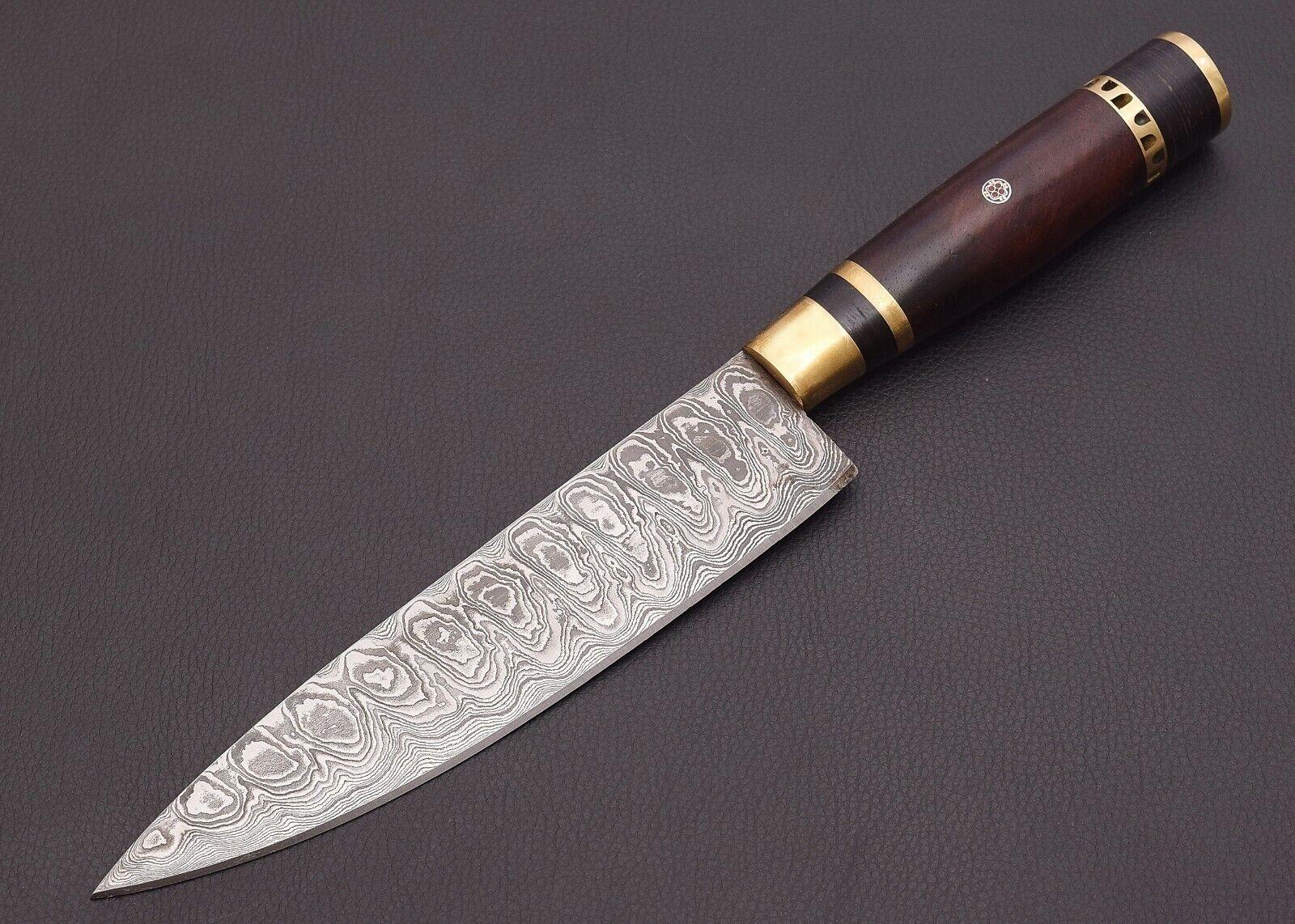This 12-inch custom handmade Damascus steel chef knife is a true work of art, combining traditional craftsmanship with premium materials. The blade is forged from high-quality Damascus steel, known for its strength, edge retention, and beautiful wave patterns. The 7-inch razor-sharp blade is perfectly balanced with a 5-inch handle crafted from rosewood, resin, brass spacers, and a solid brass bolster for an elegant yet durable grip. Designed for chefs, collectors, and outdoor enthusiasts, this knife is ideal for kitchen use, camping, or gifting. It comes with a custom leather sheath for safe storage and portability. Whether you're shopping for a groomsmen gift, a birthday present, or a unique addition to your culinary tools, this knife is a perfect gift for him or her. Please note: due to the high carbon content in Damascus steel, avoid storing the knife in the sheath for extended periods to prevent rust. Always clean with a soft cloth and apply mineral or coconut oil after use. Not for sale to individuals under 18 years of age.
