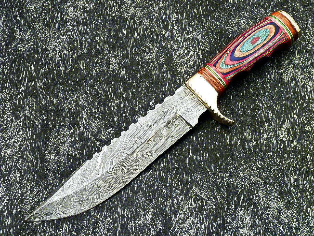 12" Damascus Bowie Knife – Multicolor Hardwood Handle & Leather Sheath