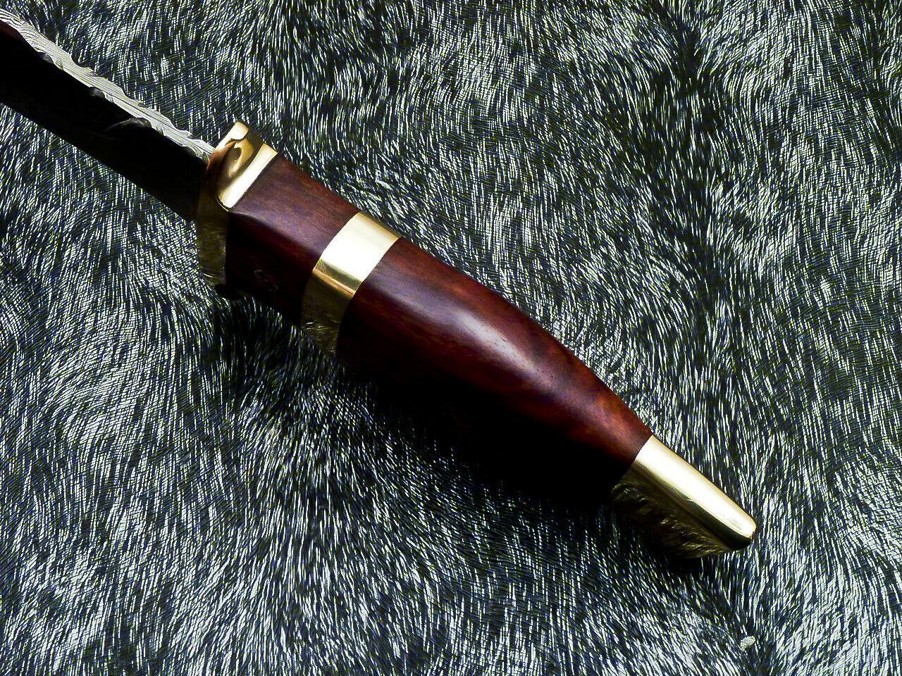 The knife features a robust natural wood handle secured with mosaic pins and strong epoxy, offering a lifetime of durability and a comfortable, ergonomic grip. The hand-cast brass bolster adds elegance and balance, while the included leather sheath ensures safe storage and transport. Each Heritage Forge Bowie knife is 100% handmade, with the Damascus patterns uniquely etched, making every piece entirely one-of-a-kind.