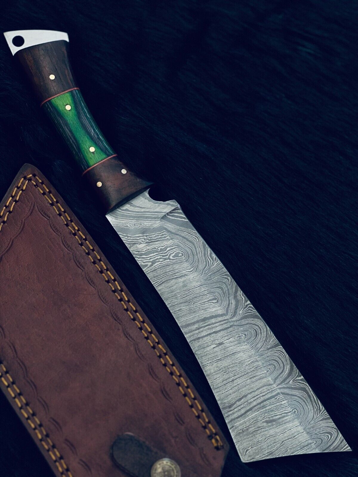 This 12" custom handmade Damascus machete knife is a striking blend of artistry and power—crafted for hunters, campers, and collectors alike. The 7-inch blade is forged from Damascus steel, featuring 512 layers of 1095 and 15N20 high-carbon steel, producing a mesmerizing twist pattern. Engineered for edge retention and sharpness, the blade undergoes expert heat treatment for a Rockwell hardness of 54–58 HRC.