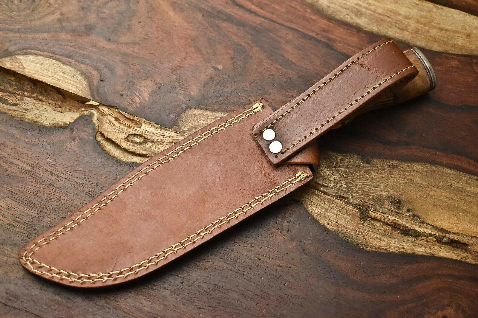 Each knife is 100% handmade without CNC machining, ensuring no two are exactly alike. Includes a custom high-quality cowhide leather sheath, hand-tooled to match the knife's rugged authenticity.