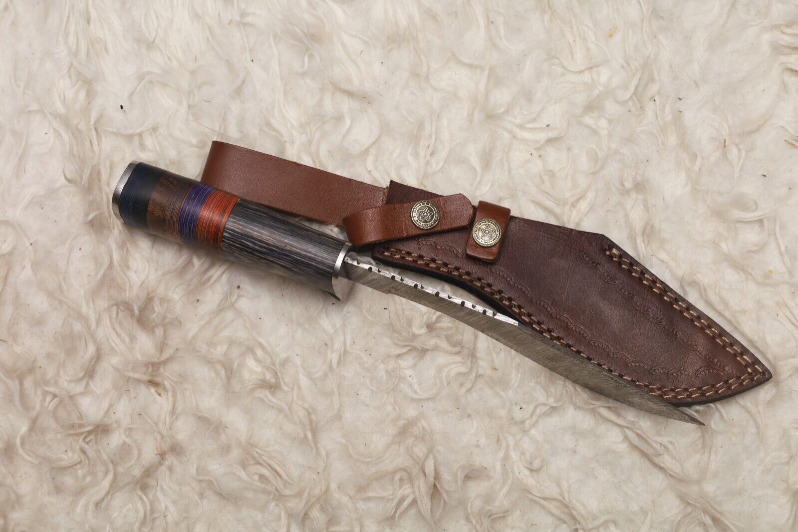 Every Heritage Forge knife is a blend of craftsmanship and utility. Whether you're collecting, gifting, or heading into the wild, this Damascus Kukri Bowie knife is a rugged and elegant companion. Comes with a premium leather sheath for protection and portability.