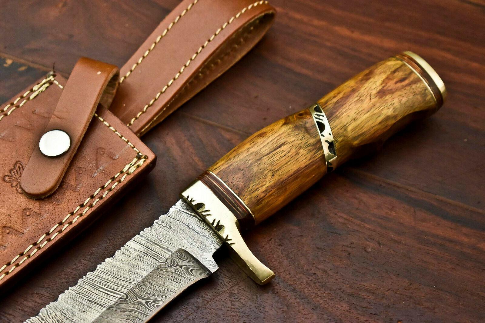 The handle is made from premium walnut wood, polished to a smooth finish for a secure and comfortable grip. With its 20-degree sharpened cutting edge, this knife is ideal for hunting, camping, or outdoor survival tasks. Every Damascus blade is acid-etched, revealing the natural contrasts of nickel and carbon steel, making each knife one of a kind.