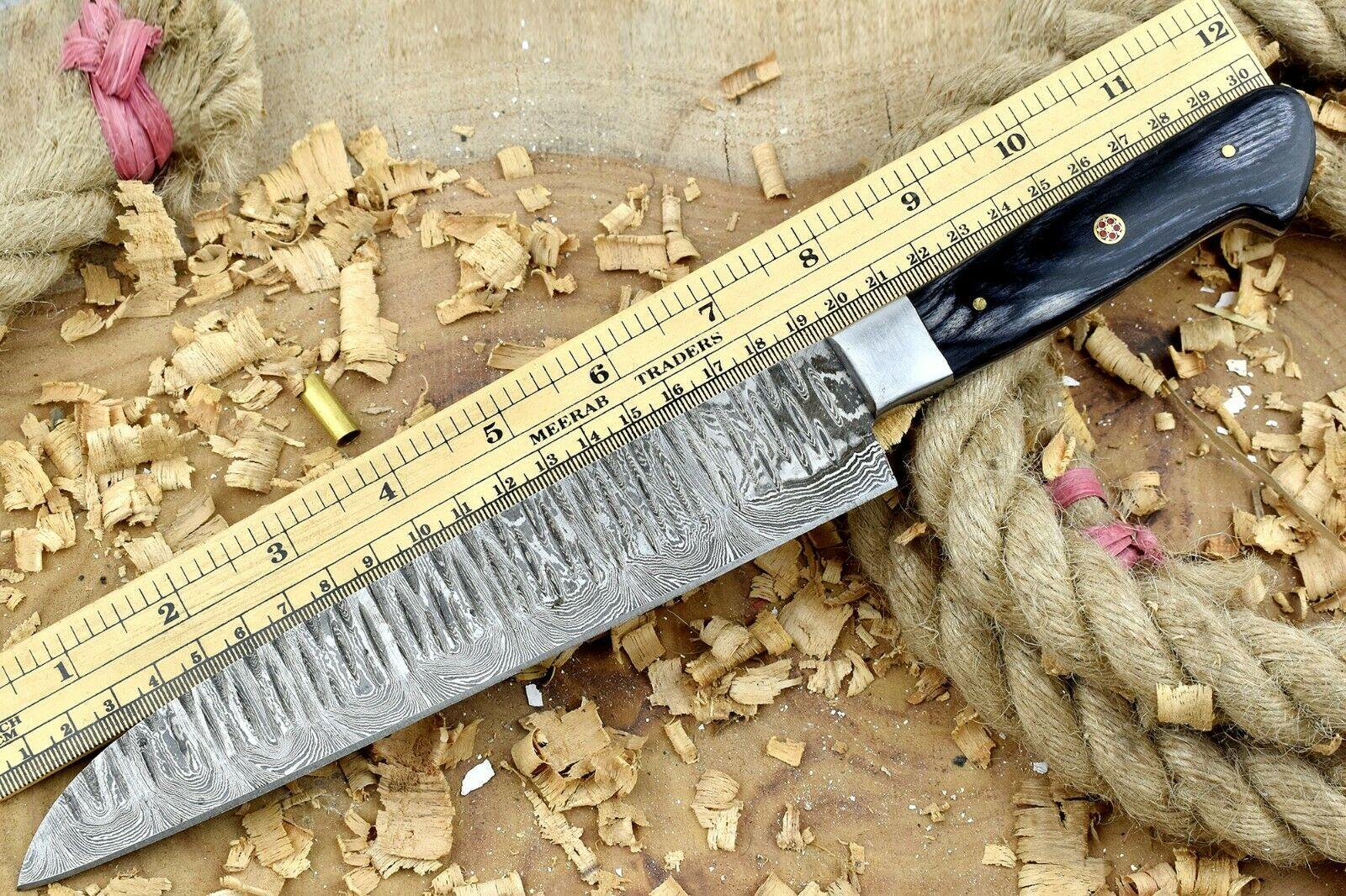 Elevate your kitchen experience with this 12-inch handmade Damascus steel chef knife, crafted for durability, precision, and style. Featuring a 7-inch razor-sharp Damascus blade and a 5-inch ergonomic handle made of premium black Pakka wood, this knife ensures comfort and control during extended use. A solid steel bolster enhances balance and adds strength, making it a reliable choice for professional chefs and home cooks alike. Forged by hand from a combination of 15N20 and 1095 high carbon steel, the blade carries approximately 512 layers, showcasing a stunning and unique Damascus pattern. With a hardness rating of 55–60 HRC, the blade maintains a razor-sharp edge for longer, perfect for slicing, chopping, dicing, and mincing with precision. At 3 mm thickness, the blade offers both cutting power and finesse, making it versatile for all kitchen tasks. Each knife is individually hand forged, meaning no two pieces are exactly the same—your knife is as unique as your cooking style. Built to last, this artisan-crafted chef knife blends functionality with beauty, making it an ideal addition to your kitchen or a perfect gift for culinary enthusiasts.