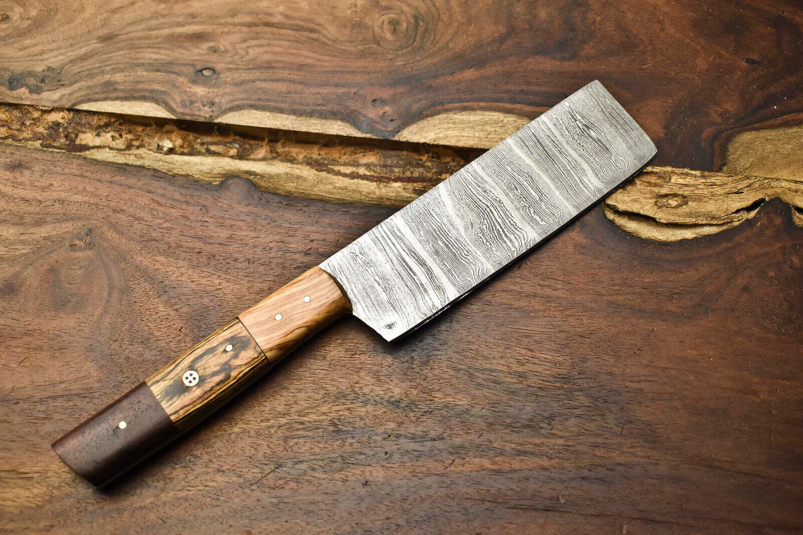 This 12" handmade Damascus steel chef knife is a professional-grade kitchen tool designed for precision, durability, and beauty. With an overall length of 12 inches, the blade measures 7 inches while the handle is 5 inches, offering excellent balance and control. The blade is oil tempered to 58–60 HRC and sharpened at a 20-degree edge for outstanding cutting performance. Crafted from a blend of 1095 high carbon steel and 15N20 nickel steel, the Damascus blade features 384 true layers forged by hand to create its distinctive patterns. Each blade undergoes an acid etching process that reveals the stunning layered design, while the handle is carefully polished for comfort and durability. This full tang chef knife is 100% handmade, making it not only a highly functional tool for chopping, slicing, and dicing but also a unique piece of craftsmanship that belongs in every kitchen.