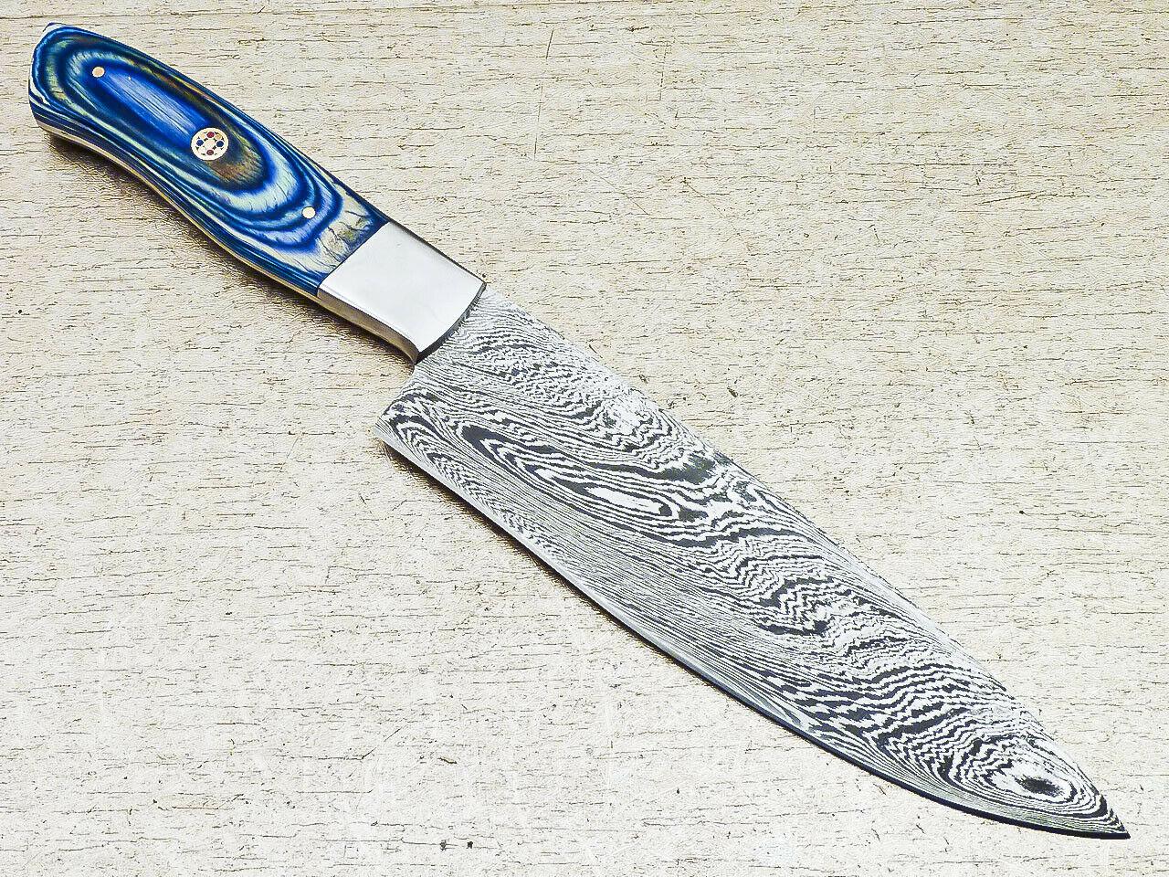 Experience the perfect blend of craftsmanship, performance, and beauty with this 12-inch handmade Damascus steel chef knife. Designed for both professional chefs and cooking enthusiasts, this knife features a 7-inch razor-sharp Damascus blade and a 5-inch hardwood handle secured with brass pins, a mosaic pin, and strong epoxy for lifetime durability. The full tang construction and handmade steel bolster add strength and balance, ensuring precision with every cut. Forged from 1095 and 15N20 high carbon steel with 512 true layers, the blade showcases a stunning flowing Damascus pattern created through hours of skilled forging. With excellent heat treatment, the edge hardness measures 50–54 HRC, while the spine measures 42–45 HRC, providing both sharpness and resilience. The 4 mm thick blade offers superior edge retention and is hand-ground to perfection, with a false edge left on the top side for enhanced design. Whether you’re slicing, chopping, or dicing, this chef knife delivers professional-grade performance and an artisanal touch. Each knife is 100% handmade, making it not only a reliable kitchen tool but also a unique collectible piece.