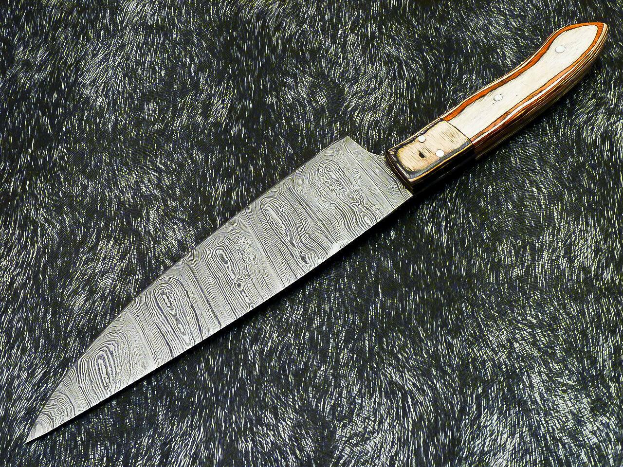 This 12-inch professional handmade Damascus steel chef knife is a must-have for chefs and cooking enthusiasts who appreciate quality, durability, and craftsmanship. Each knife is carefully hand-forged from premium Damascus steel, crafted with 1095 and 15N20 high carbon steels layered into 512 true layers. The forging process creates a stunning, unique pattern across the blade while ensuring long-lasting strength and sharpness. Measuring 12 inches overall, with a 7-inch blade and a 5-inch hardwood handle, this knife provides perfect balance and control for slicing, chopping, and precision cutting in the kitchen. The blade is 4mm thick and undergoes excellent heat treatment, achieving Rockwell hardness of 50–54 along the edge for superior sharpness retention and 42–45 along the spine for flexibility. The hardwood handle is beautifully designed and secured with brass pins and strong epoxy, ensuring lifetime durability and a comfortable grip. This handmade Damascus knife is more than just a cooking tool—it is an artisan piece that brings elegance and efficiency to any kitchen. Every blade is unique, making it a one-of-a-kind addition for chefs, collectors, or anyone looking for a premium knife that combines tradition with modern performance.