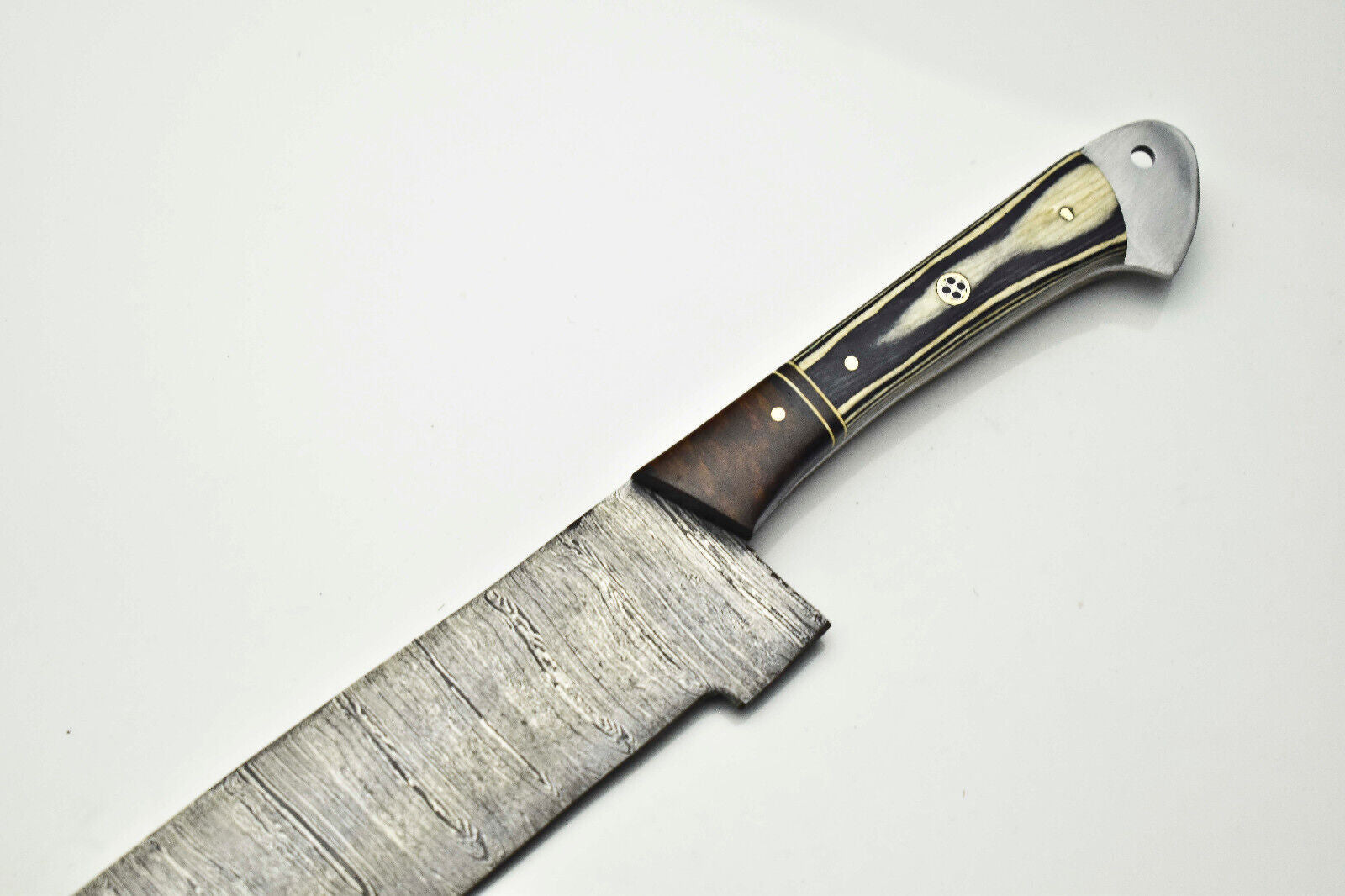 This 12-inch handmade Damascus steel kitchen chef knife features a full tang forged blade crafted from 384 layers of 1095 high carbon steel and 15N20 nickel carbon. The blade is oil tempered to a hardness of 58-60 HRC, ensuring superior durability and edge retention. Sharpened at a precise 20-degree angle, this knife offers exceptional cutting performance for all your kitchen tasks.The authentic Damascus pattern is revealed through a detailed acid etching process, turning the nickel layers to satin silver and the high carbon layers to a rich black-gray, highlighting the blade’s unique layered design. The handle is polished to a smooth satin finish, providing a comfortable and secure grip. This knife is perfect for professional chefs and cooking enthusiasts who value both style and functionality.