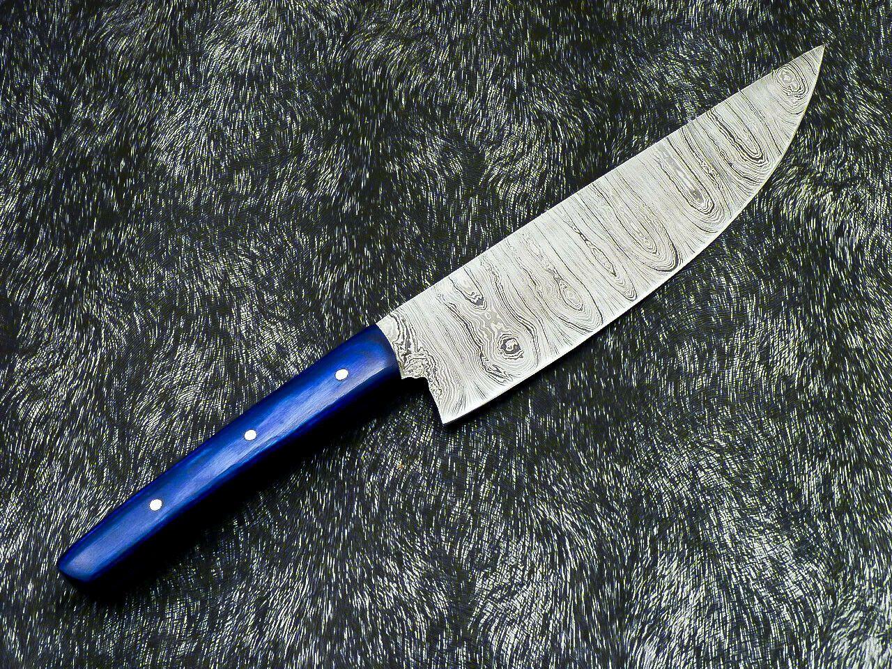 This 12-inch Professional Handmade Damascus Chef Knife is the perfect balance of performance, durability, and style. With an overall length of 12 inches, it features a 7-inch razor-sharp blade and a 5-inch handle crafted from beautiful hardwood, fastened securely with brass pins and reinforced with strong epoxy for lifetime durability. Each blade is hand-forged from a blend of 1095 and 15N20 high-carbon steel, folded repeatedly to create 512 true layers of Damascus steel. This time-intensive process produces the stunning Damascus wave pattern that runs all the way to the edge, making every knife unique. The blade undergoes expert heat treatment to achieve a Rockwell hardness of 50–54 along the edge and 42–45 along the spine, delivering both sharpness and toughness. At 4 mm thick, the blade provides excellent strength and stability, with precise hand grinds on both sides and a false edge on the spine for better balance and cutting efficiency. Unlike standard knives, the microscopic saw-tooth effect of Damascus steel allows this blade to keep cutting long after others have dulled. Perfect for professional chefs and cooking enthusiasts, this handcrafted Damascus chef knife is designed to elevate your kitchen experience with exceptional sharpness, durability, and timeless craftsmanship.