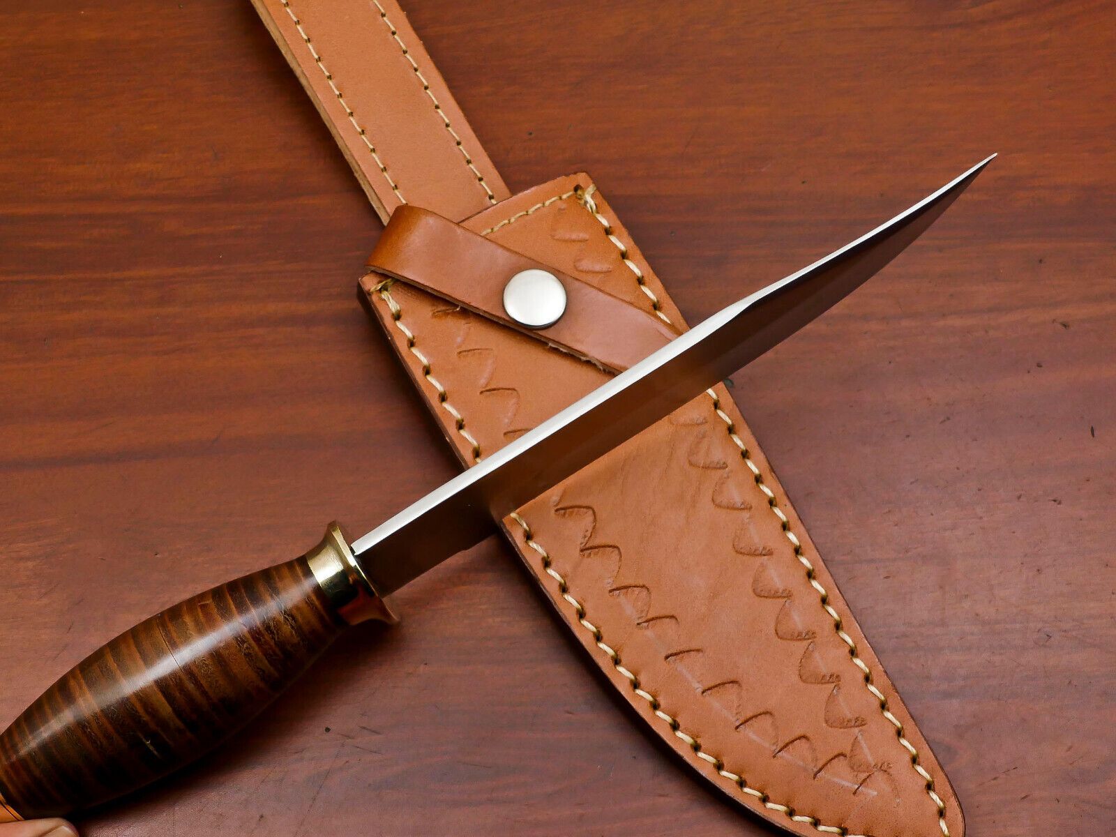 This 12-inch Handmade D2 Steel Clip Point Full Tang Bowie Hunting Knife is designed to deliver both strength and precision in the great outdoors. Forged from high-quality D2 tool steel, the blade is exceptionally hard, resistant to wear, and capable of maintaining a razor-sharp edge through extended use. The clip point design offers superior control and piercing ability, making this knife an excellent choice for hunting, skinning, and survival tasks. Built with a full tang construction, it provides outstanding durability and balance, ensuring it can withstand heavy-duty use in the field. The ergonomic handle is crafted for comfort and grip security, giving you confidence whether working in wet or dry conditions. Each knife is carefully handmade, showcasing fine craftsmanship and unique detailing that adds to its collectible value. A sturdy sheath is included, allowing for safe storage and convenient portability. Whether you are a seasoned hunter, camper, survivalist, or knife collector, this D2 Clip Point Bowie knife is a versatile and reliable tool that combines practicality with rugged elegance. Add this handmade masterpiece to your outdoor gear or knife collection and experience exceptional performance with every cut.