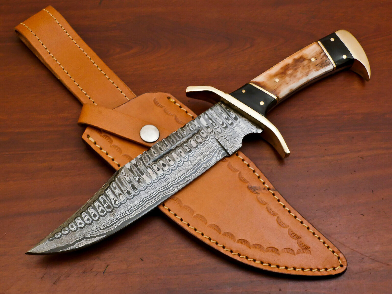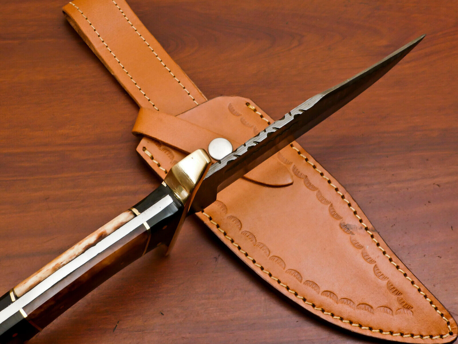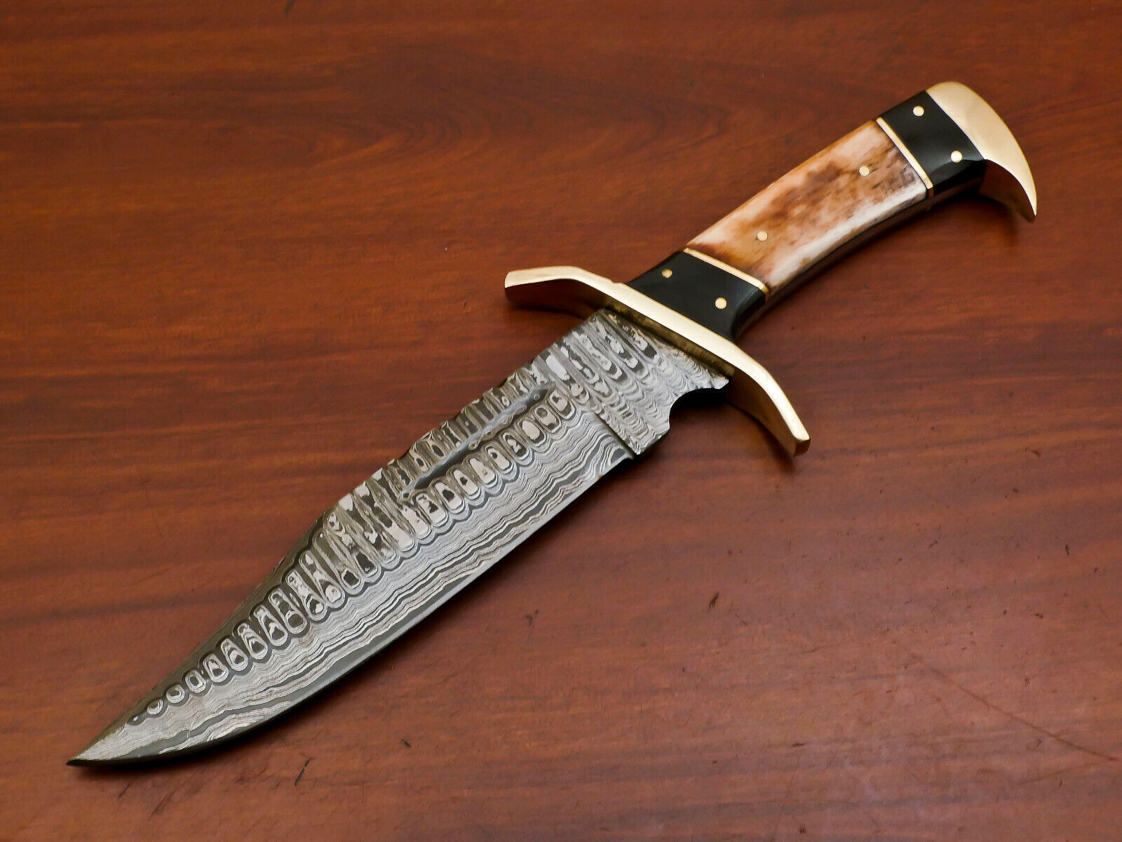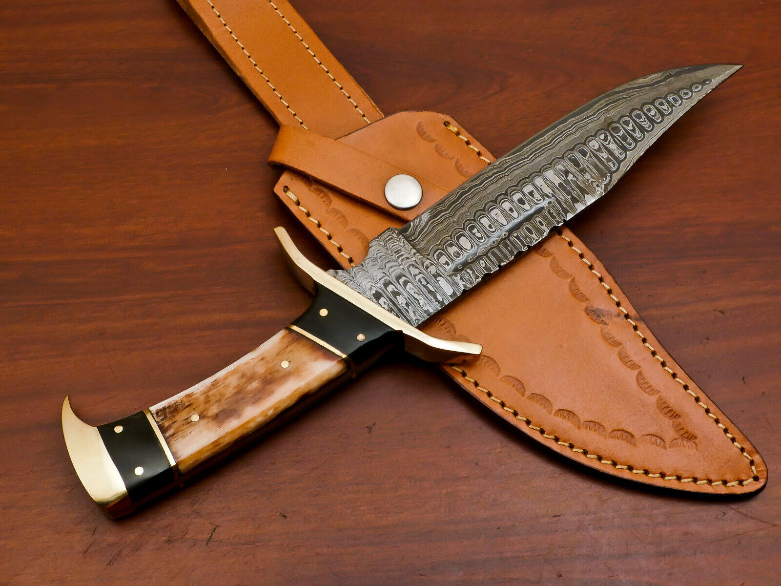 12 Inch Handmade Damascus Steel Bowie Hunting Knife with Camel Bone and Bull Horn Handle