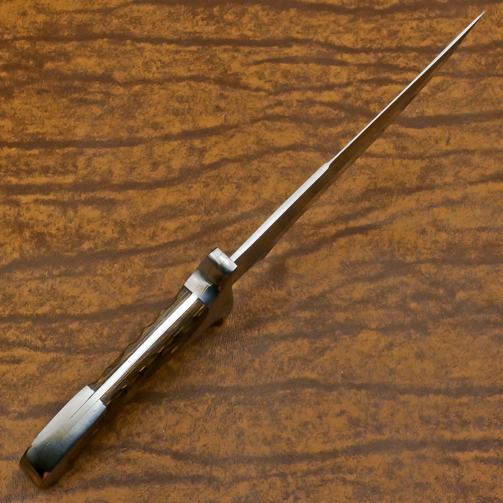 Elevate your outdoor adventures with this 12-inch handmade stainless steel Bowie hunting knife, designed for strength, performance, and durability. Crafted with a full tang construction, this knife ensures maximum balance and reliability, making it an essential tool for hunters, campers, and outdoor enthusiasts. The stainless steel blade is engineered with a sharp edge for precision cutting, skinning, and survival tasks, while its heavy-duty build provides long-lasting performance even in rugged conditions.This Bowie knife comes complete with a custom sheath for safe storage and easy carrying, ensuring you’re always prepared in the field or on the trail. Its ergonomic handle offers a secure and comfortable grip, reducing fatigue during extended use. Whether you’re heading on a hunting trip, camping in the wilderness, or looking for a collector’s piece, this large Bowie knife is the perfect choice.