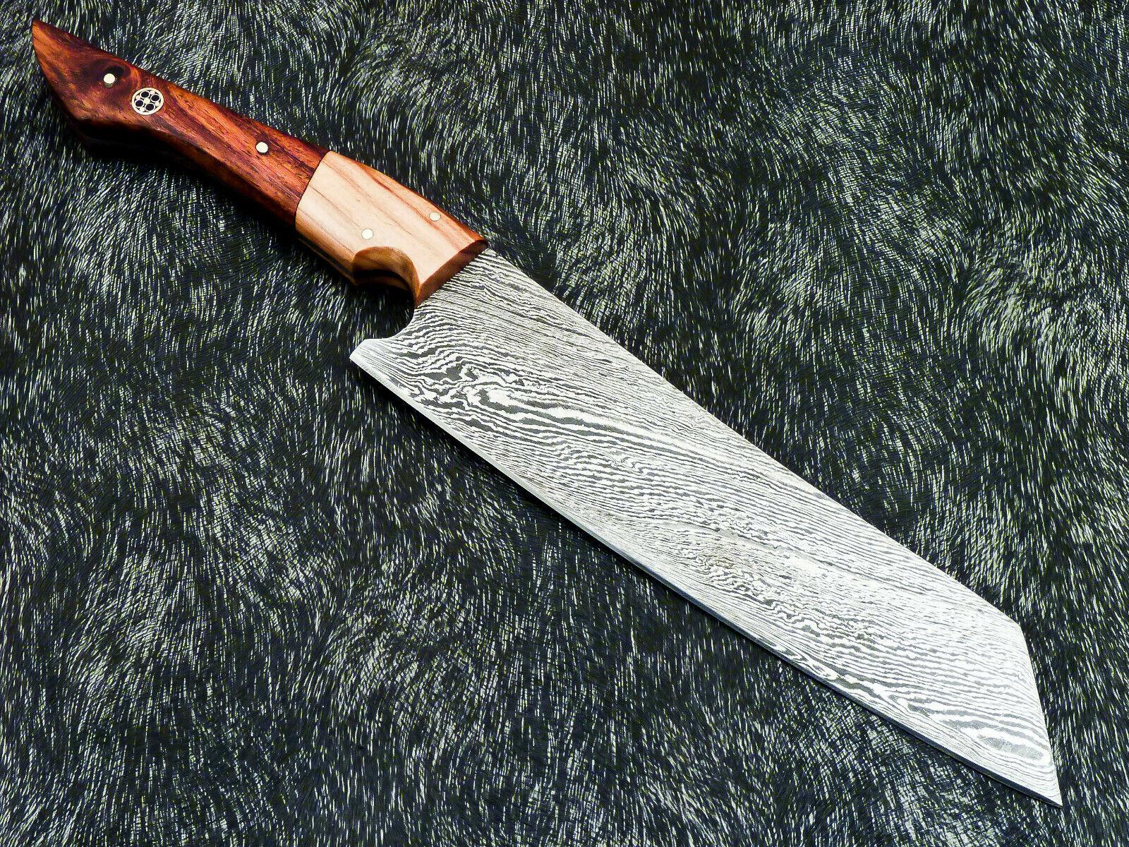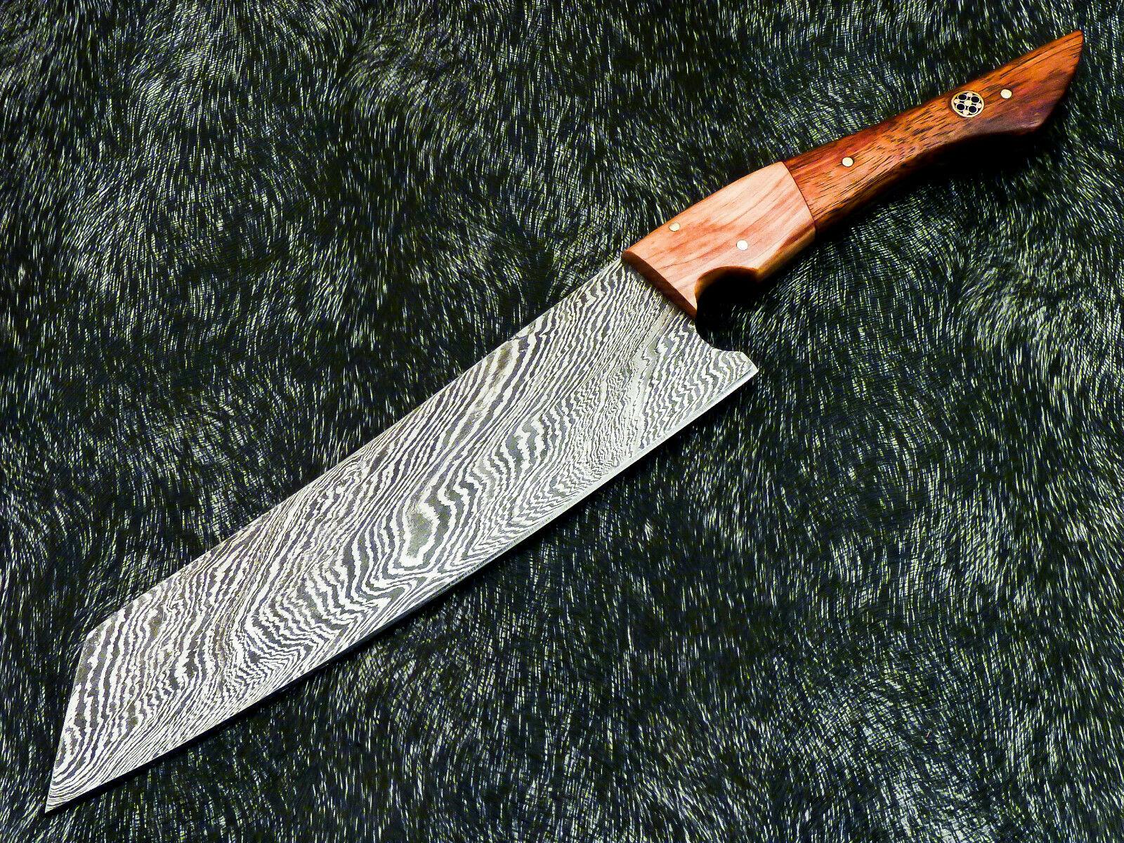 This 12-inch professional Damascus steel chef knife with olive wood handle is a handcrafted masterpiece designed for durability, precision, and aesthetic appeal. Each knife is 100% handmade, featuring a 7-inch blade, a 5-inch olive wood handle, and an overall length of 12 inches. The blade is forged from a premium mixture of 1095 and 15N20 high carbon steel, folded to create 512 layers, producing a striking Damascus pattern. The microscopic saw-blade effect allows the blade to maintain its sharpness while other knives dull, ensuring exceptional cutting performance.The blade is heat-treated with a Rockwell hardness of 50–54 along the edge and 42–45 along the spine, and is 4 mm thick with expertly hand-ground bevels and a false edge on the top side. The olive wood handle features natural wood scales fastened with brass pins, mosaic pins, and strong epoxy, ensuring lifetime durability. Ideal for professional kitchen use, camping, or hunting, this knife is both a functional tool and a collectible artisan piece.
