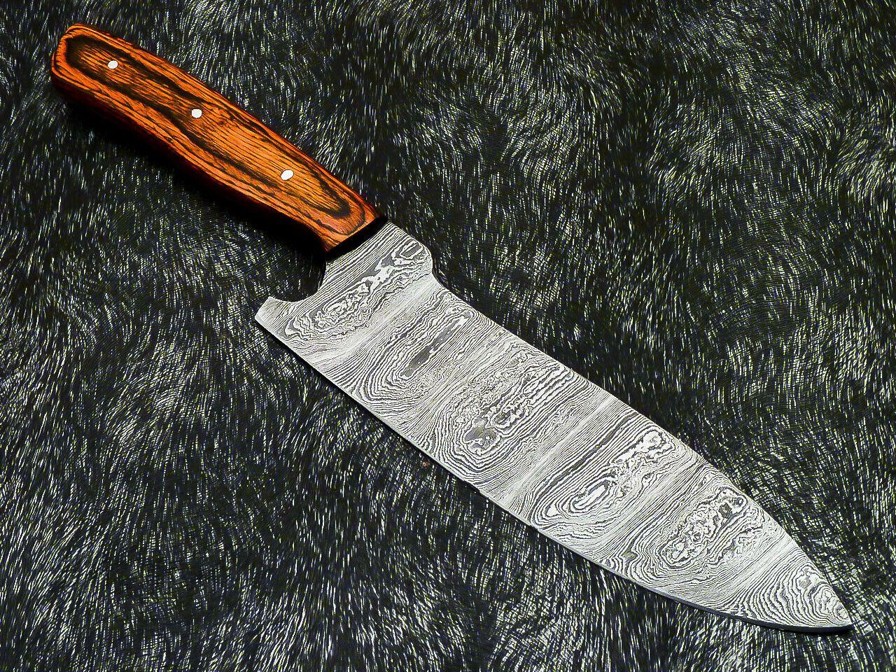 This 12" Professional Handmade Damascus Chef Knife is a true work of art, designed to deliver exceptional performance in any kitchen. With an overall length of 12 inches, a 7-inch blade, and a 5-inch hardwood handle, this knife combines beauty, strength, and precision. The blade is hand-forged from 1095 and 15N20 high-carbon steel, featuring 512 true layers that create the stunning Damascus pattern. Forged through hours of meticulous craftsmanship, the blade not only showcases a unique design but also offers superior cutting ability thanks to the microscopic saw-blade effect of Damascus steel. Heat treated to a Rockwell hardness of 50–54 along the edge and 42–45 along the spine, the blade holds its sharp edge longer while maintaining durability and toughness. The 4 mm thickness ensures stability and perfect balance for chopping, slicing, and dicing. The hardwood handle is fastened with brass pins and secured with strong epoxy, ensuring a lifetime of reliability and comfort in the grip. Each knife is handmade, making it one-of-a-kind and built to last. Whether for professional chefs or passionate home cooks, this Damascus Chef Knife is the ultimate blend of functionality and craftsmanship, guaranteed to enhance your culinary experience.