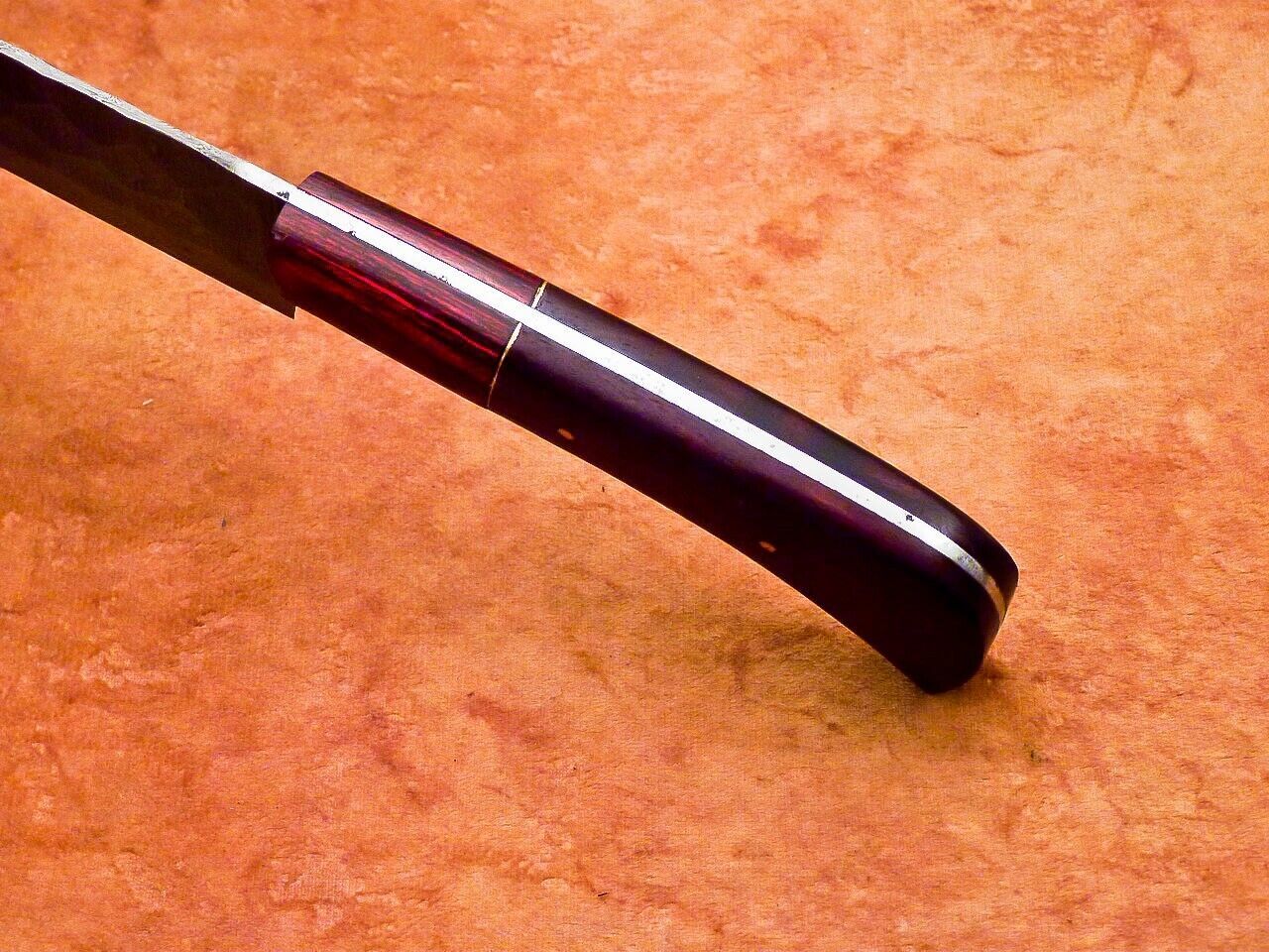 This 12-inch Professional Handmade Damascus Steel Chef Knife is a true masterpiece of craftsmanship, combining beauty, durability, and superior cutting performance. With an overall length of 12 inches, the knife features a 7-inch Damascus steel blade and a 5-inch handle crafted from beautiful hard wood, reinforced with brass pins and a handmade steel bolster for strength and long-lasting use. Expertly hand forged from 1095 and 15N20 high carbon steel, the blade is constructed with 512 true layers, creating a striking flowing pattern unique to Damascus craftsmanship. At 4 mm thick, the blade delivers outstanding balance and resilience, with hand grinds on both sides and a sleek false edge on the top. The Rockwell hardness measures 50–54 HRC along the edge for exceptional sharpness and edge retention, while the spine registers 42–45 HRC for flexibility and durability. The unique Damascus layering produces a microscopic saw-blade effect, allowing the knife to remain razor sharp longer than ordinary blades. Each knife is 100% handmade, ensuring that every piece is truly one of a kind. Please note that this knife comes without a leather sheath. Ideal for professional chefs, cooking enthusiasts, and collectors, this handmade Damascus knife is not only a functional kitchen essential but also a work of art.