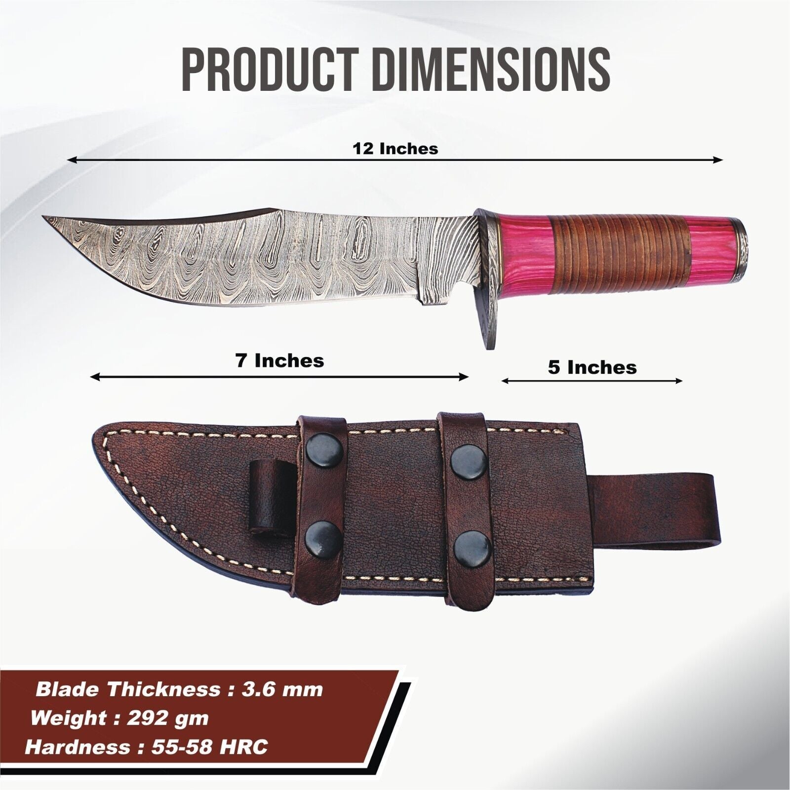 Crafted for performance and admired for beauty, the 12-inch custom Damascus Bowie knife from Heritage Forge is a masterpiece of blade artistry and outdoor utility. The 7-inch fixed blade features a stunning twist pattern Damascus steel, forged from multiple layers to create an intricate texture and exceptional sharpness. With a Rockwell hardness rating of 57–60 HRC, this knife maintains a razor edge even after extensive use.