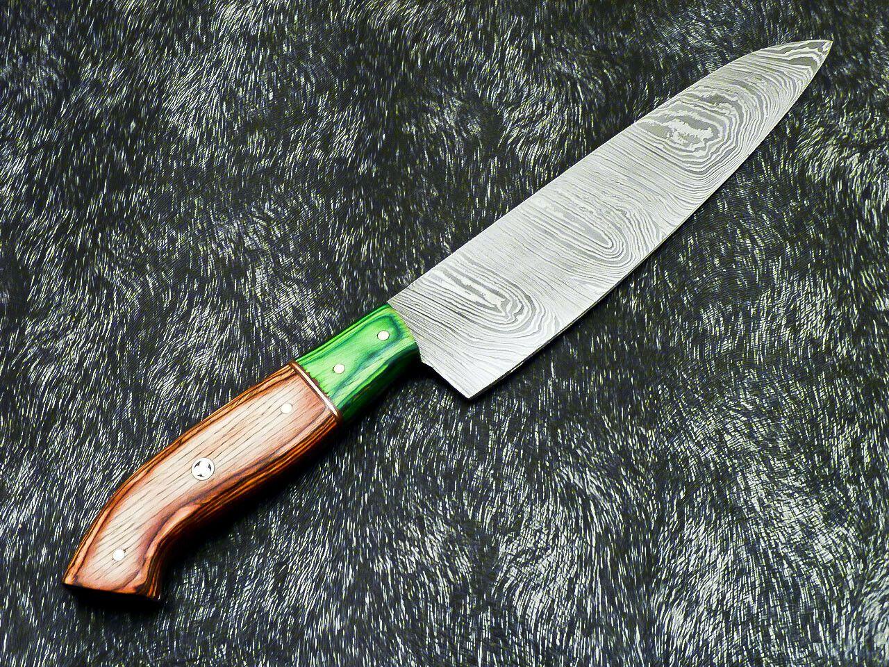This 13.0" professional handmade Damascus steel chef knife is a true combination of craftsmanship, durability, and elegance, designed to meet the needs of both professional chefs and passionate home cooks. Hand forged from premium Damascus steel, this blade is created by folding 1095 and 15N20 high-carbon steels into more than 500 layers, producing a unique and striking wave pattern across the surface. Each layer enhances the strength and edge retention of the knife, ensuring superior sharpness and long-lasting performance in the kitchen. The blade measures approximately 8.0 inches, with an overall length of 13.0 inches and a 5.0-inch handle crafted from beautiful hardwood. The handle is secured with brass pins, a mosaic pin, and strong epoxy for lifetime durability, offering a comfortable and firm grip even during extended use. With a Rockwell hardness rating of 50–54 along the edge, this knife maintains a razor-sharp cut, while the spine hardness of 42–45 provides flexibility and resilience. The blade is also 4 mm thick with expert hand grinds, giving it excellent balance and precision. Perfect for slicing, dicing, and chopping, this handmade Damascus chef knife is not just a tool but a piece of art that will elevate any kitchen.