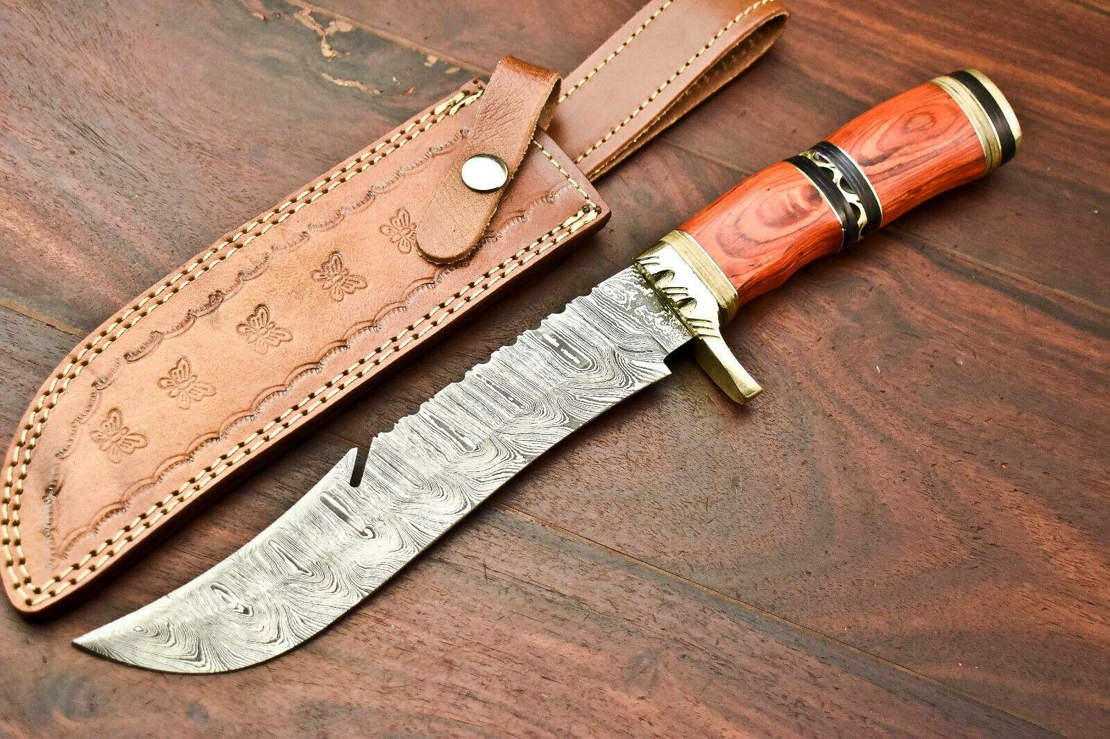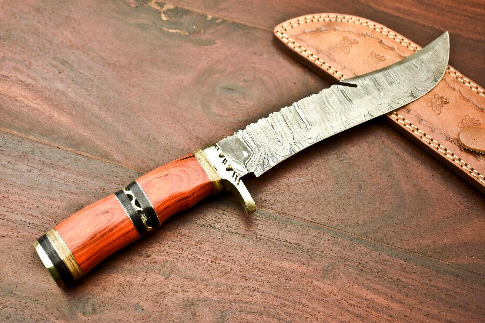 13.5" Damascus Bowie Knife – Hardwood Handle & Leather Sheath