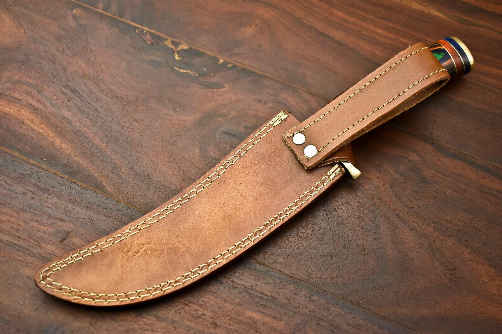 13.5” Handmade Damascus Bowie Knife | Hardwood Handle & Leather Sheath