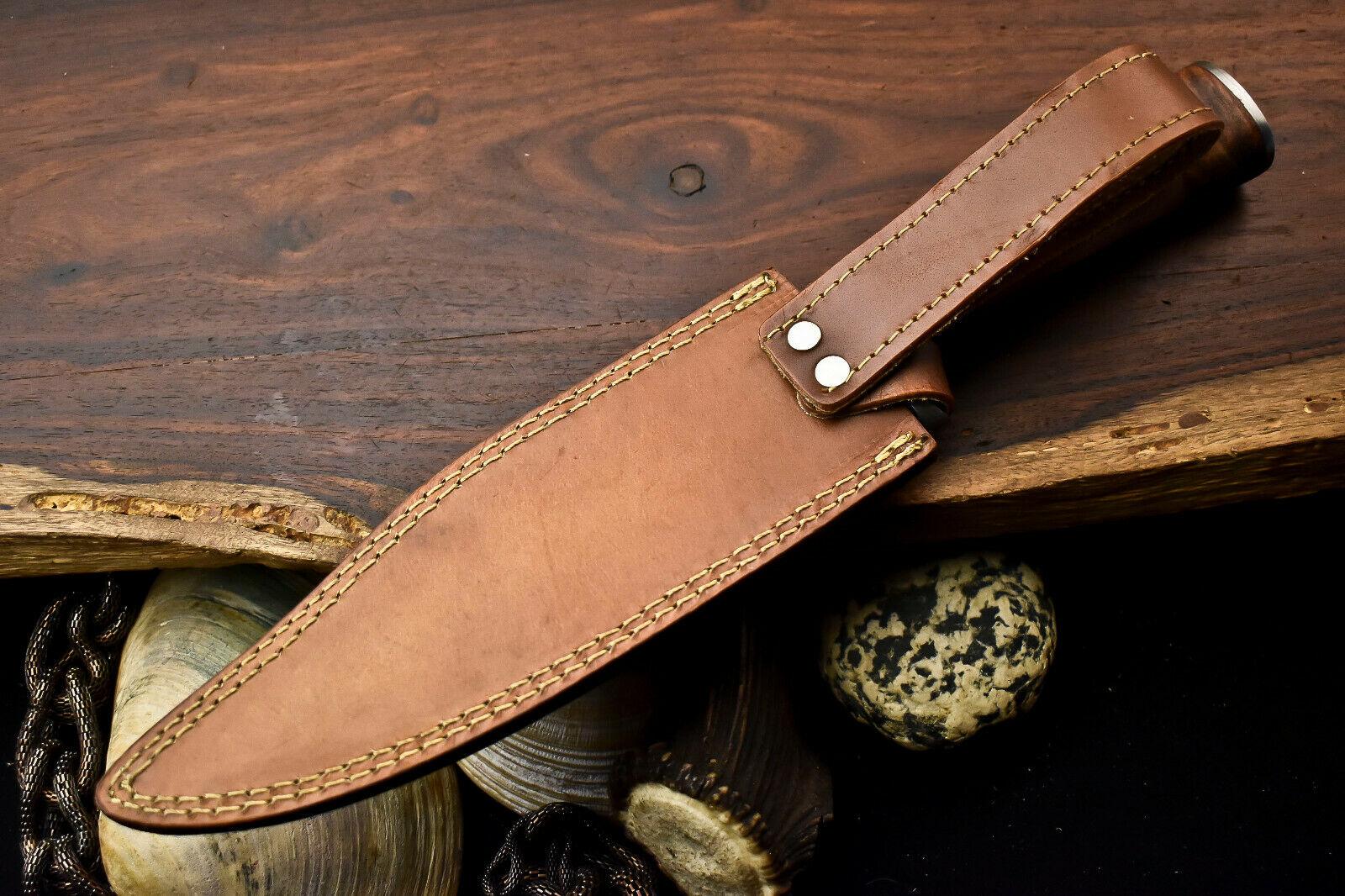 The handle is made from camel bone, providing a secure and comfortable grip for precision during hunting, skinning, or camping tasks. With full tang construction, the knife ensures balance, strength, and long-lasting durability, making it suitable for both outdoor work and collector display.