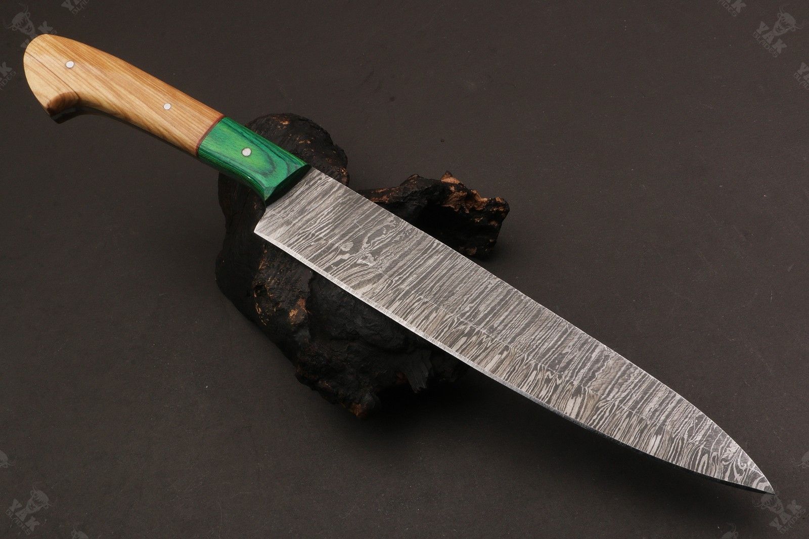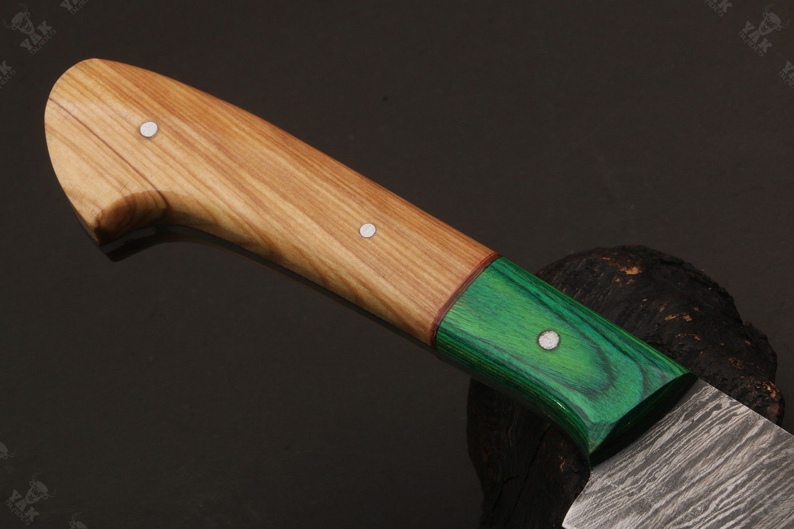 This 13-inch custom hand forged Fire Damascus Steel Santoku Chef Knife is a masterpiece of craftsmanship, designed to deliver both functionality and elegance. Expertly crafted by YAK Knives, this versatile knife is ideal for cooking, camping, hunting, or gifting to knife enthusiasts. The knife features a stunning 8-inch Damascus steel blade with a full tang construction, known for its incredible strength and edge retention. The handle is made from stained camel bone and natural wood, accented with brass spacers and a handmade Damascus bolster, ensuring a comfortable and secure grip. With a blade thickness of 4mm, this knife offers durability and sharpness that lasts. Each blade is meticulously hand forged, producing beautiful layered patterns unique to Damascus steel, which not only enhance its visual appeal but also improve cutting efficiency with a natural micro-saw effect. Whether used in the kitchen or the outdoors, this custom Santoku knife stands out as a reliable, durable, and stylish tool.