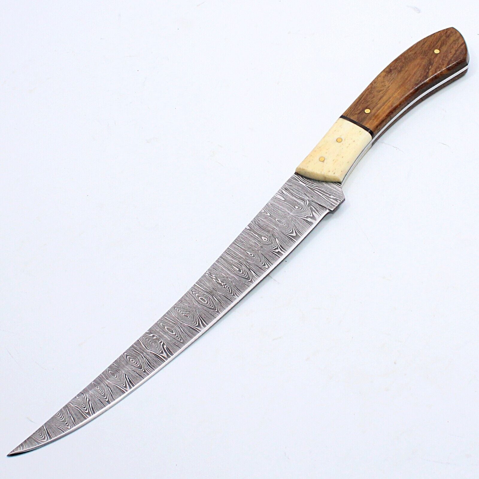 This 13-inch Custom Handmade Twist Damascus Steel Brisket Fillet Chef Hunting Knife is crafted with precision and durability for both outdoor use and kitchen performance. Featuring an 8-inch razor-sharp blade with a stunning twist Damascus pattern, this knife is forged from layers of high carbon steel and nickel steel, producing a unique and striking design. Each blade is heat-treated and hardened to 57–60 HRC, ensuring exceptional edge retention, toughness, and long-lasting sharpness. The full tang construction provides strength and balance, making it a reliable tool for slicing brisket, filleting fish, or tackling hunting and camping tasks. The included premium leather sheath offers safe storage and portability, adding both function and style. As each knife is handmade, the Damascus steel patterns will differ, making every piece one-of-a-kind. Tested for performance and durability, our knives deliver professional results in edge holding, honing, and toughness under varied applications. Perfect for chefs, hunters, collectors, and outdoor enthusiasts, this knife is a must-have addition to any collection.
