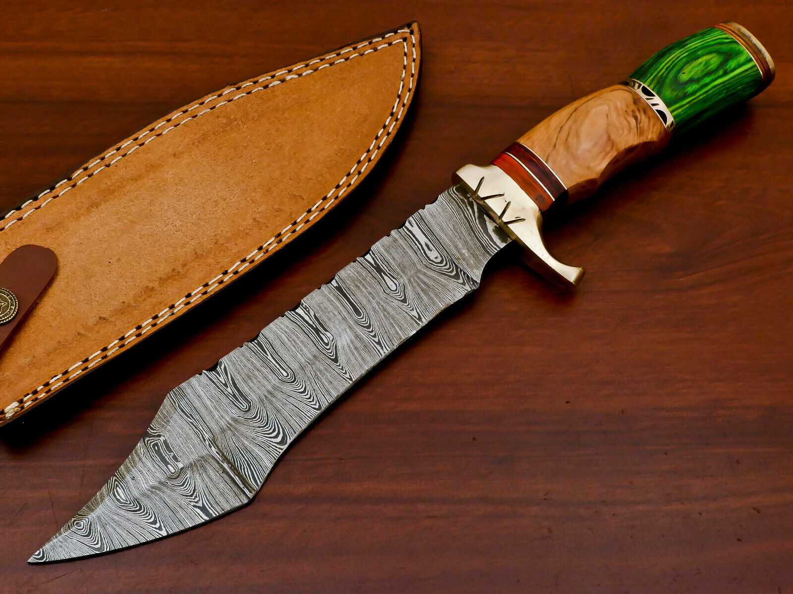 13" Damascus Bowie Knife | Olive & Pakka Wood Handle