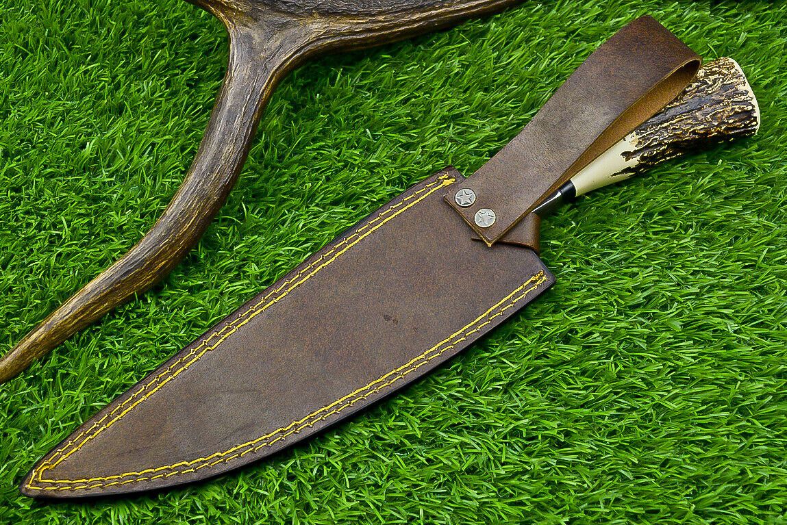 Forged from 1095 and 15N20 high carbon steels, the 384-layer Damascus blade measures approximately 13 inches in overall length and holds a Rockwell hardness of 54–58 HRC, offering exceptional edge retention and cutting strength. The beautiful natural stag horn handle is paired with a hand-cast Damascus bolster, combining rustic charm with robust functionality.
