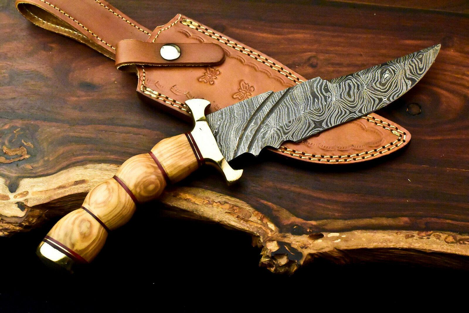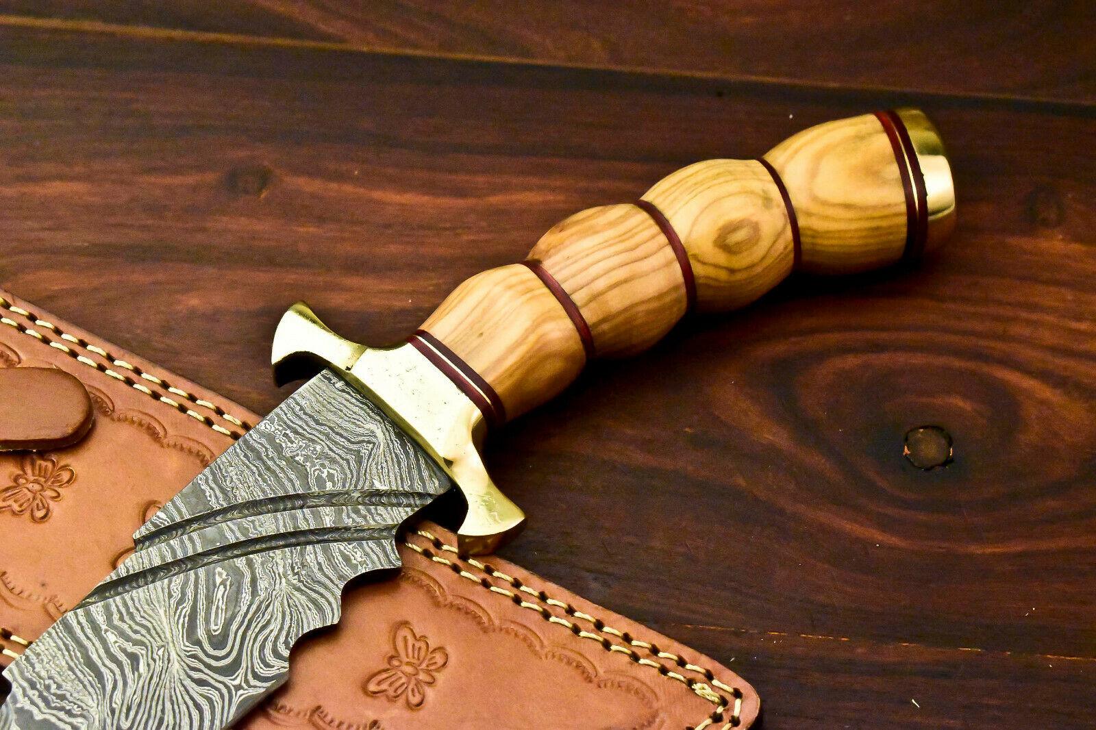 13" Handmade Damascus Bowie Knife | Olive Wood Handle & Leather Sheath