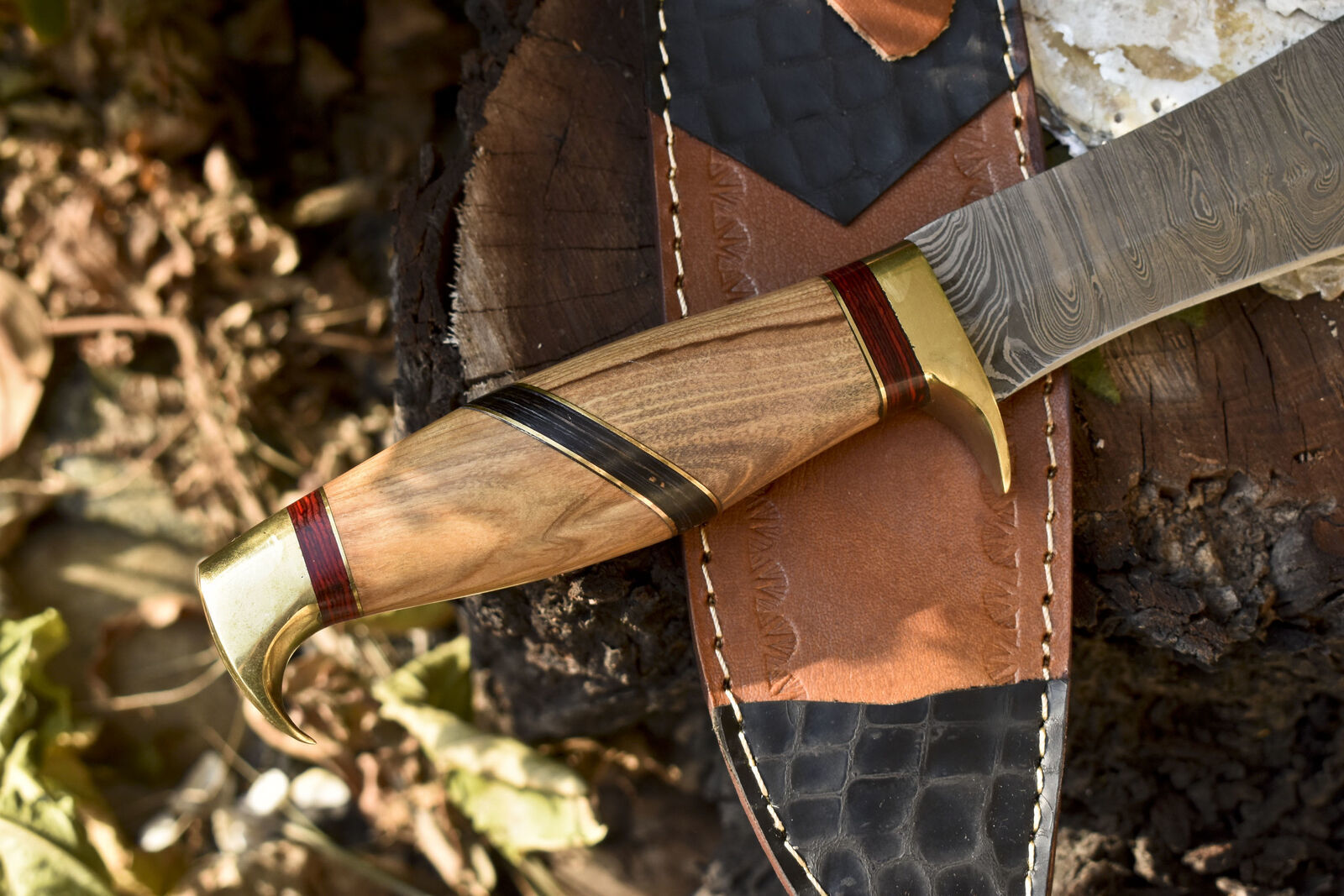 13 Inch Handmade Damascus Steel Bowie Knife with Olive Wood Handle and Leather Sheath