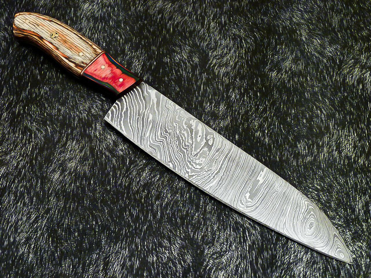 Experience the perfect combination of craftsmanship, durability, and performance with this 13-inch professional Damascus steel chef knife. Every knife is meticulously handmade, ensuring a unique design and exceptional quality for chefs, home cooks, and collectors alike. The blade measures approximately 8 inches, with an overall length of 13 inches and a comfortable 5-inch hard wood handle. Constructed from 512 layers of 1095 and 15N20 high-quality steel, the Damascus blade exhibits a stunning twist pattern that enhances both beauty and functionality.