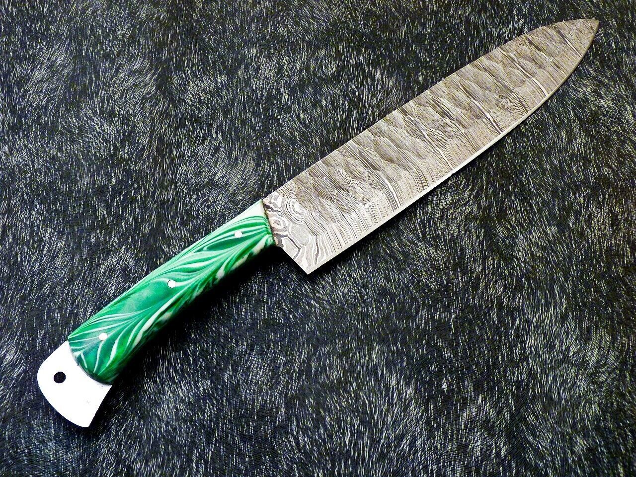 Discover the perfect combination of craftsmanship and performance with this 13" Professional Damascus Steel Chef Knife featuring a sturdy resin handle. Each knife is custom handmade, with the blade forged from 1095 high carbon steel and 15N20 nickel steel, folded 512 times to create authentic Damascus layers. The result is a stunning, high-quality blade with a saw-blade effect at the microscopic level, providing superior cutting precision and long-lasting sharpness. The blade has undergone excellent heat treatment, achieving a Rockwell hardness of 50-54 along the edge and 42-45 along the spine. With an overall length of 13", including an 8" blade and 5" handle, and a thickness of 4 mm with expertly hand-grinded sides, this chef knife is ideal for professional kitchens, home chefs, and collectors seeking a unique, high-performance tool.