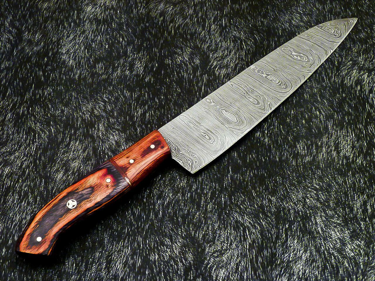 This 13" Professional Handmade Damascus Chef Knife is a masterpiece of craftsmanship, combining elegance, durability, and superior performance. With an overall length of 13 inches, this chef knife features an 8-inch blade and a 5-inch handle crafted from premium hardwood, fastened with brass and mosaic pins, and reinforced with strong epoxy for lifetime durability. The blade is hand-forged from 1095 and 15N20 high-carbon steel, folded over and over to create 512 true layers of Damascus steel. This meticulous process results in the signature Damascus wave pattern, flowing beautifully to the edge of the blade and ensuring each knife is one-of-a-kind. The blade undergoes excellent heat treatment, achieving a Rockwell hardness of 50–54 along the edge and 42–45 along the spine, delivering the perfect balance of toughness, strength, and edge retention. At 4 mm thick, the blade offers fantastic stability with hand-ground edges and a false edge on the spine for improved balance. The microscopic saw-blade effect of Damascus steel ensures this knife keeps cutting long after other blades have dulled. Whether used in a professional kitchen or at home, this handmade Damascus chef knife is designed for precision cutting, long-lasting sharpness, and unmatched style.