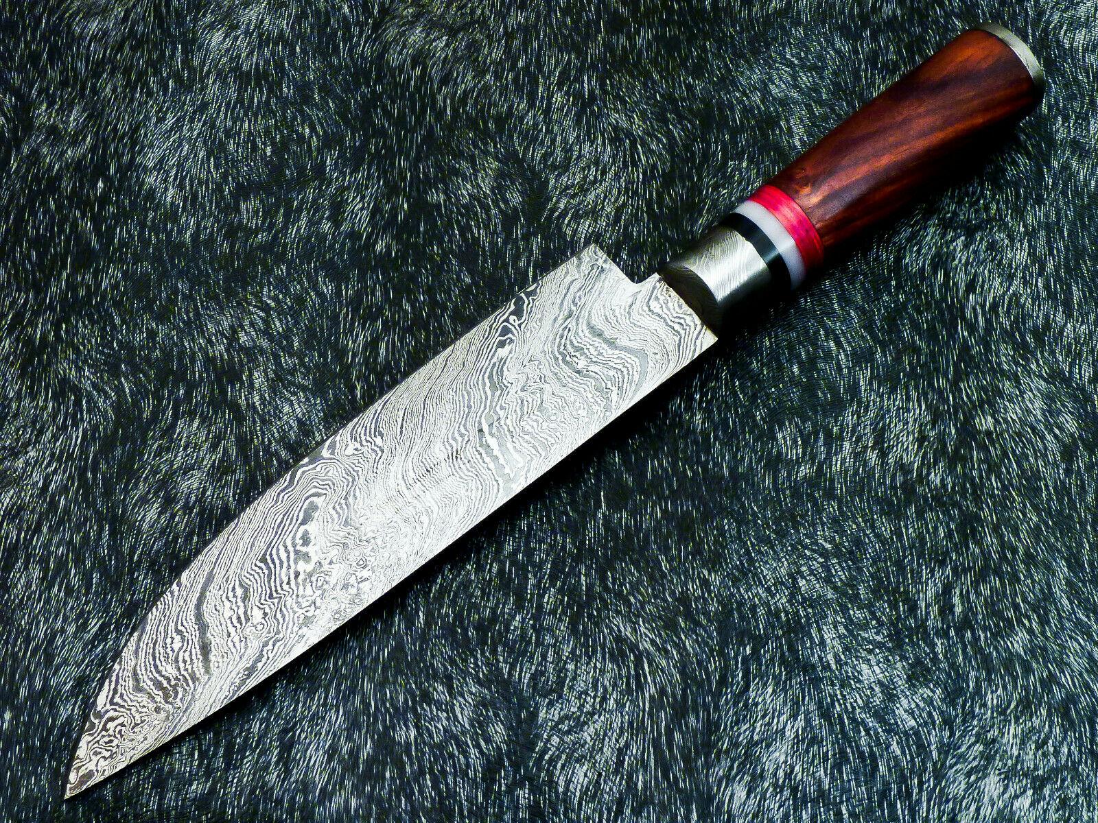 This 13-inch professional kitchen chef knife is a stunning example of handmade craftsmanship. Featuring a high-quality Damascus steel blade forged from 1095 and 15N20 high carbon steel, it boasts 512 true layers that create a distinctive saw-blade effect at the microscopic level, allowing the blade to stay sharp longer than ordinary knives. The blade measures approximately 8 inches, with an overall length of 13 inches and a 5-inch natural wood handle. Each knife is carefully hand-polished, heat-treated for Rockwell hardness of 50-54 along the edge and 42-45 along the spine, and finished with a beautiful handmade Damascus steel bolster. This unique design ensures durability, balance, and precision, making it ideal for professional chefs and home cooks alike. Every knife is fully handmade and unique, meaning no two patterns are exactly alike. Please note that this knife does not include a leather sheath.