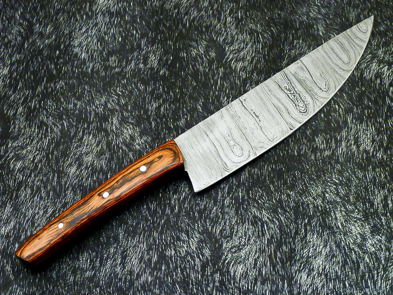 The handle is made from high-quality hard wood scales, fastened securely with brass pins and reinforced with strong epoxy for lifetime durability. Expert hand grinds and a false edge on the top side provide exceptional balance, control, and cutting efficiency. Without a leather sheath, this knife is ready for immediate professional or home kitchen use. Perfect for chefs, culinary enthusiasts, and collectors, this handmade Damascus chef knife combines elegance, durability, and functionality. Its striking layered Damascus pattern makes each knife unique, offering both aesthetic appeal and high performance. This is more than a kitchen tool—it’s a long-lasting investment in quality craftsmanship.