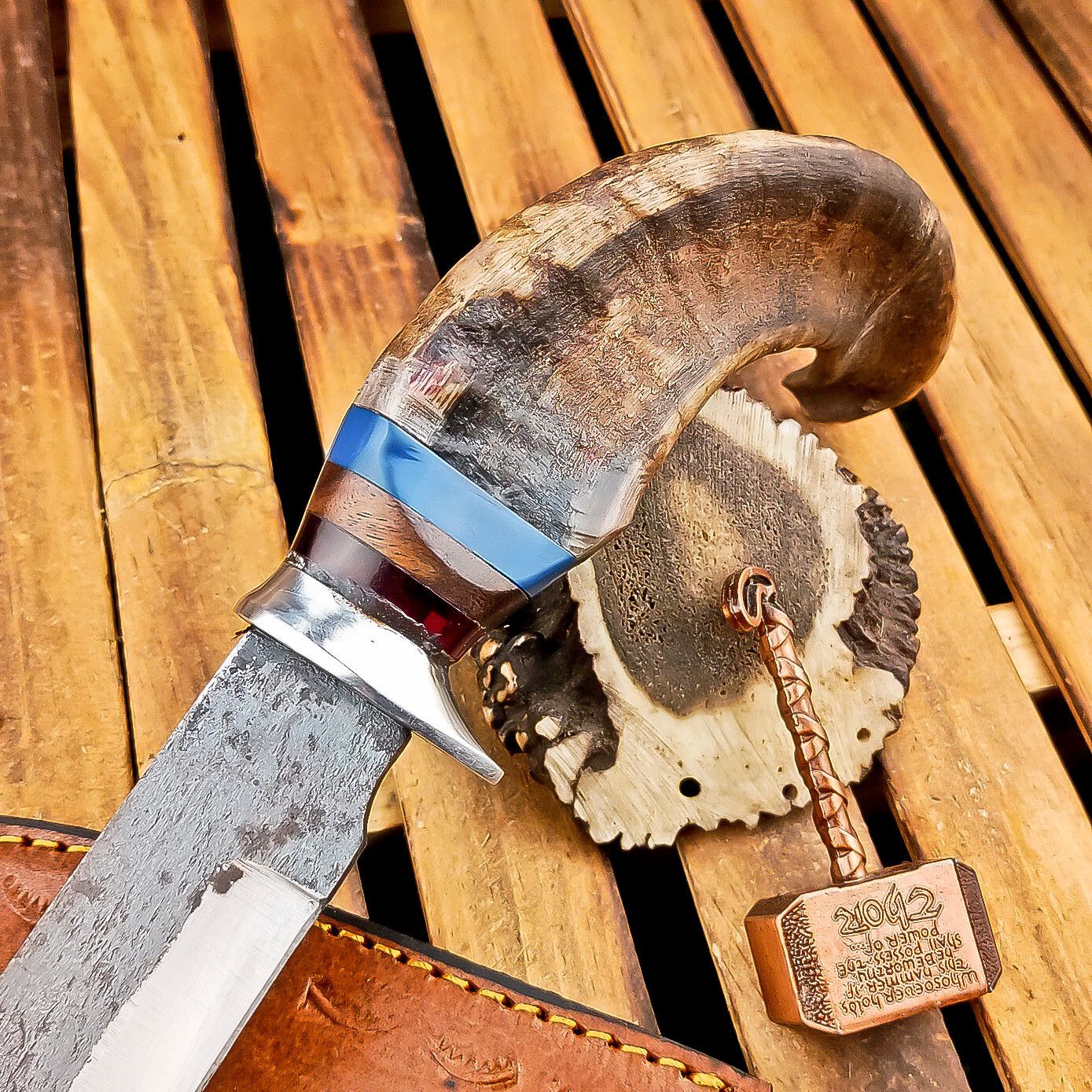 The handle, carved from genuine ram horn, is accented with a hand-casted steel bolster, offering both grip and elegance. Every knife is finished by hand, from layered forging to acid etching, enhancing the mesmerizing Damascus wave patterns. Ideal for camping, hunting, or display, this full-tang knife comes with a premium leather sheath for protection and carry.