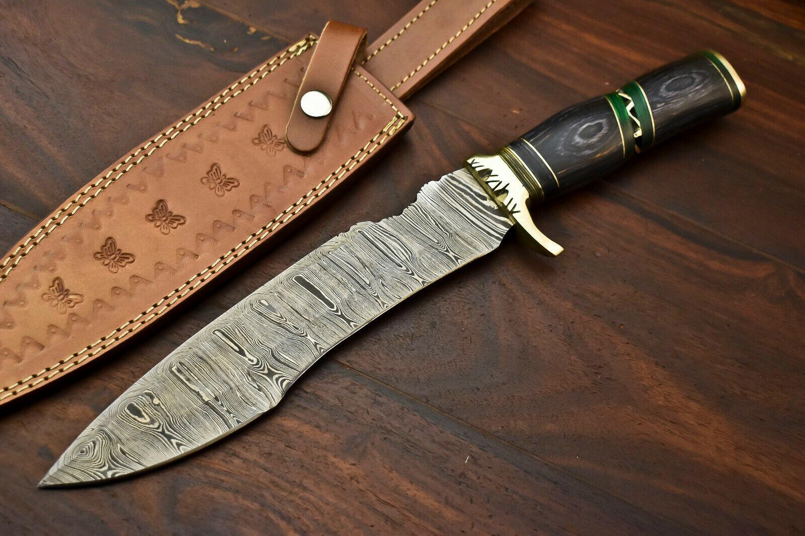 14.5" Handmade Damascus Steel Bowie Knife | Hardwood Handle & Leather Sheath
