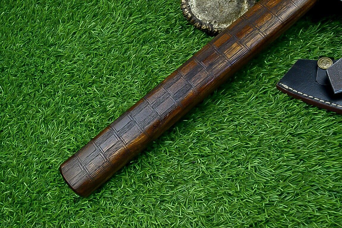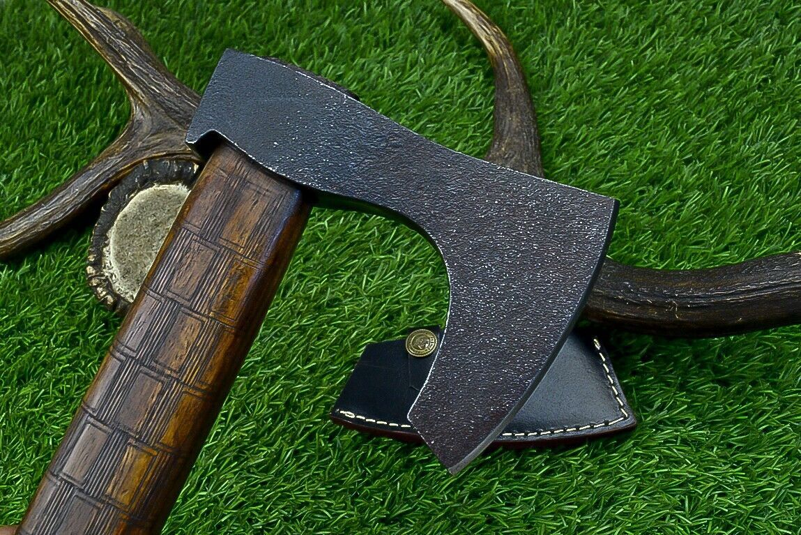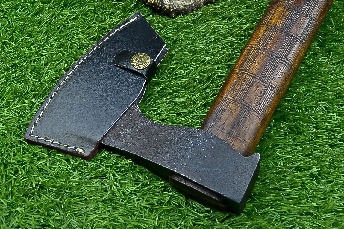 This handmade Viking tomahawk axe is a battle-ready piece of craftsmanship designed for strength, precision, and authenticity. Measuring 14.5 inches overall, it features a sturdy natural wood handle that provides excellent grip and control for both display and practical use. The axe head is forged from high-quality carbon steel and heat-treated to a hardness of 54–58 HRC, ensuring a sharp, resilient edge that can withstand heavy use. The integral design enhances durability, making this Viking hatchet ideal for outdoor activities such as camping, chopping, and throwing practice. Its compact size and balanced weight make it versatile while still carrying the bold presence of traditional Viking battle axes. A hand-stitched leather sheath is included for safe storage and easy transport, protecting the blade when not in use. Every detail of this replica Viking axe reflects Norse artistry and functionality, from the clean lines of the blade to the natural finish of the handle. Perfect for collectors, reenactors, or outdoorsmen, this Viking combat axe is both a reliable working tool and a striking historical display piece, blending timeless design with modern usability.