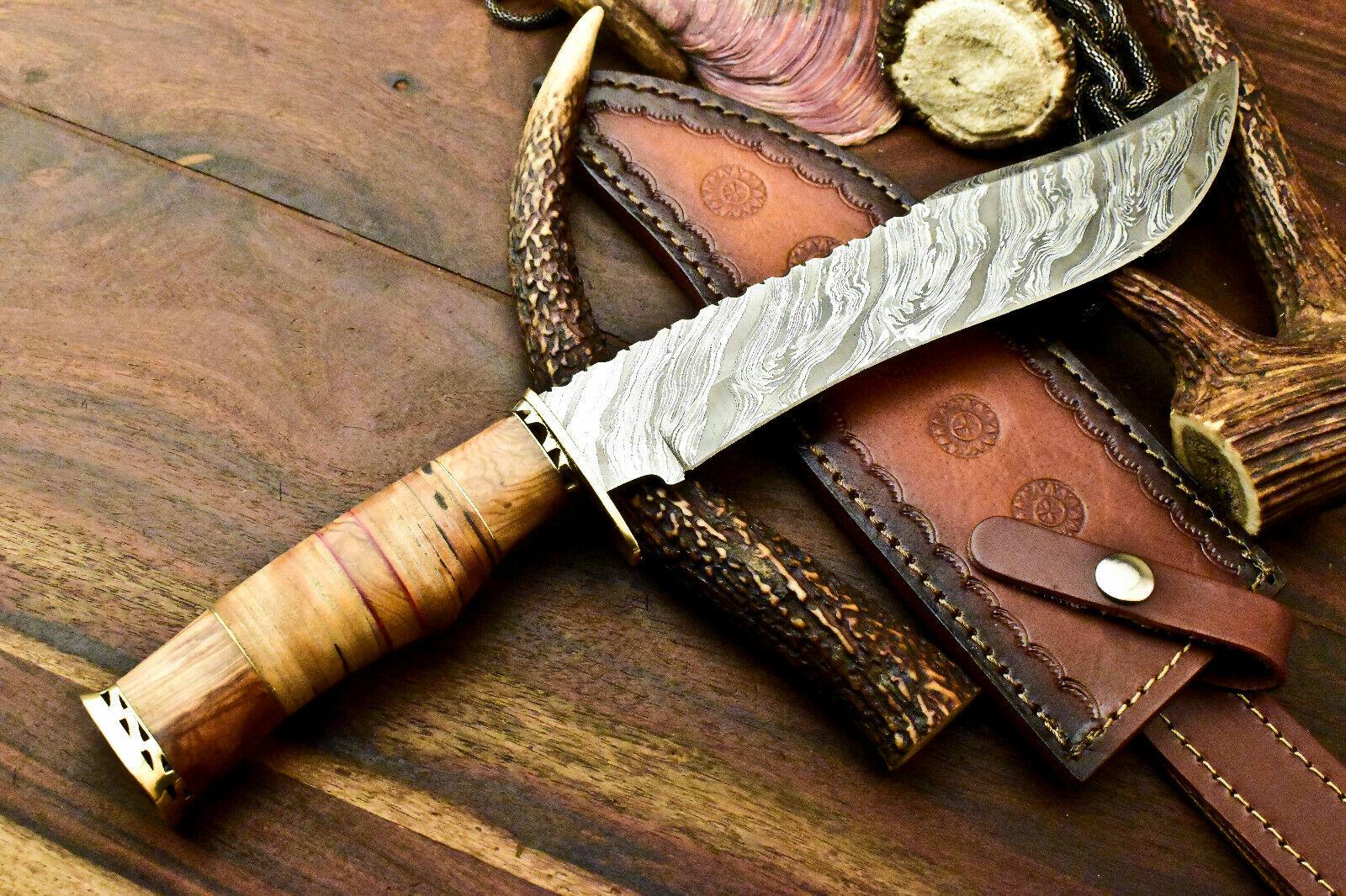 The Damascus Bowie Knife from Heritage Forge is a rare, handcrafted masterpiece built for collectors, hunters, and outdoor enthusiasts. Measuring 14 inches overall, this knife features a 9-inch Damascus steel blade forged from 1095 high-carbon steel and 15N20 nickel steel in an intricate 384-layer pattern. Oil-tempered to 58–60 HRC, it delivers exceptional edge retention and strength.