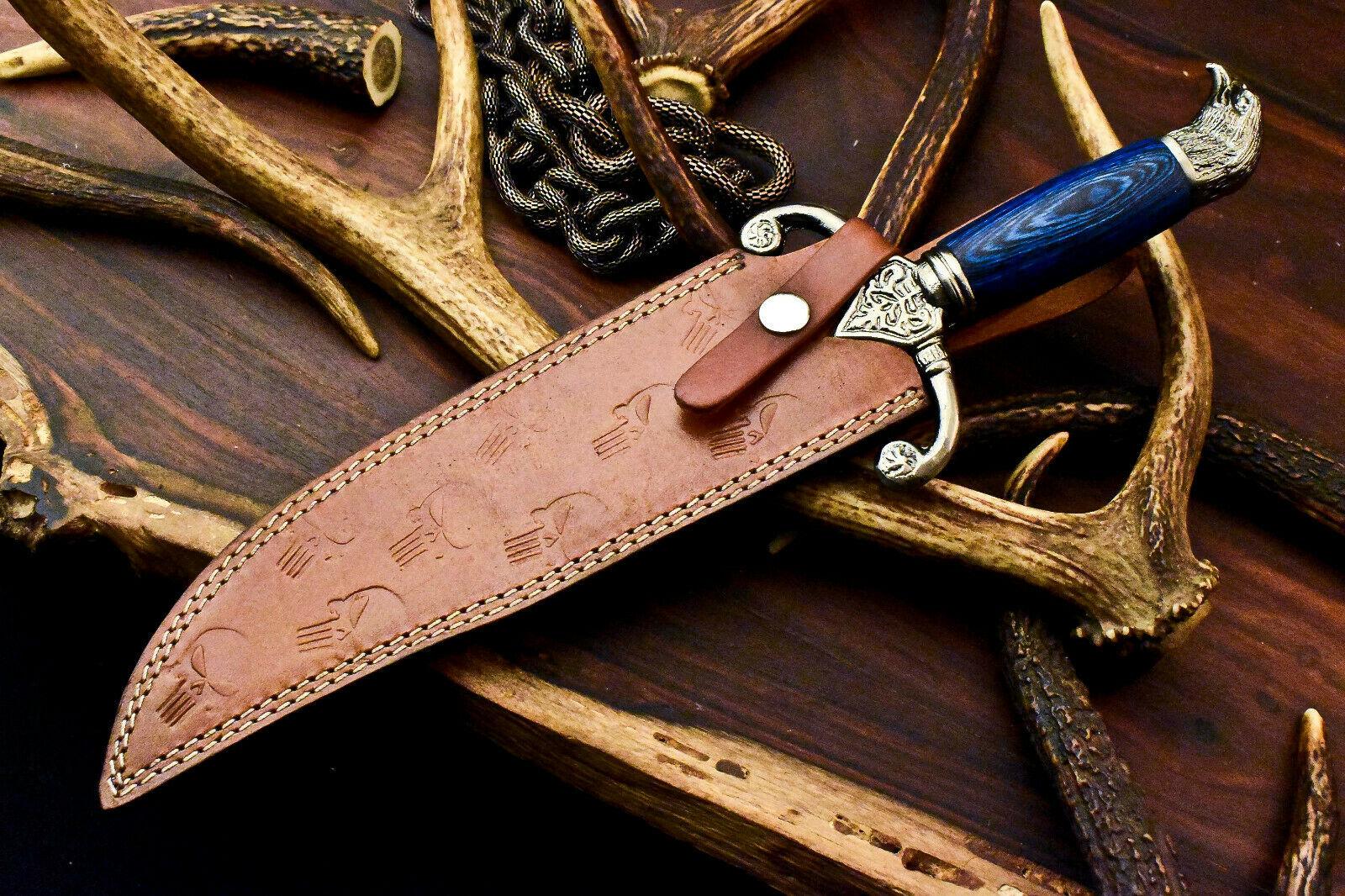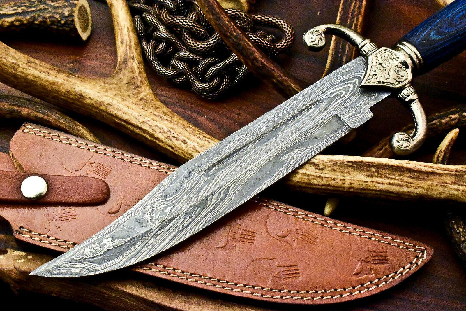 14" Handmade Damascus Steel Bowie Knife – Hardwood Handle with Leather Sheath