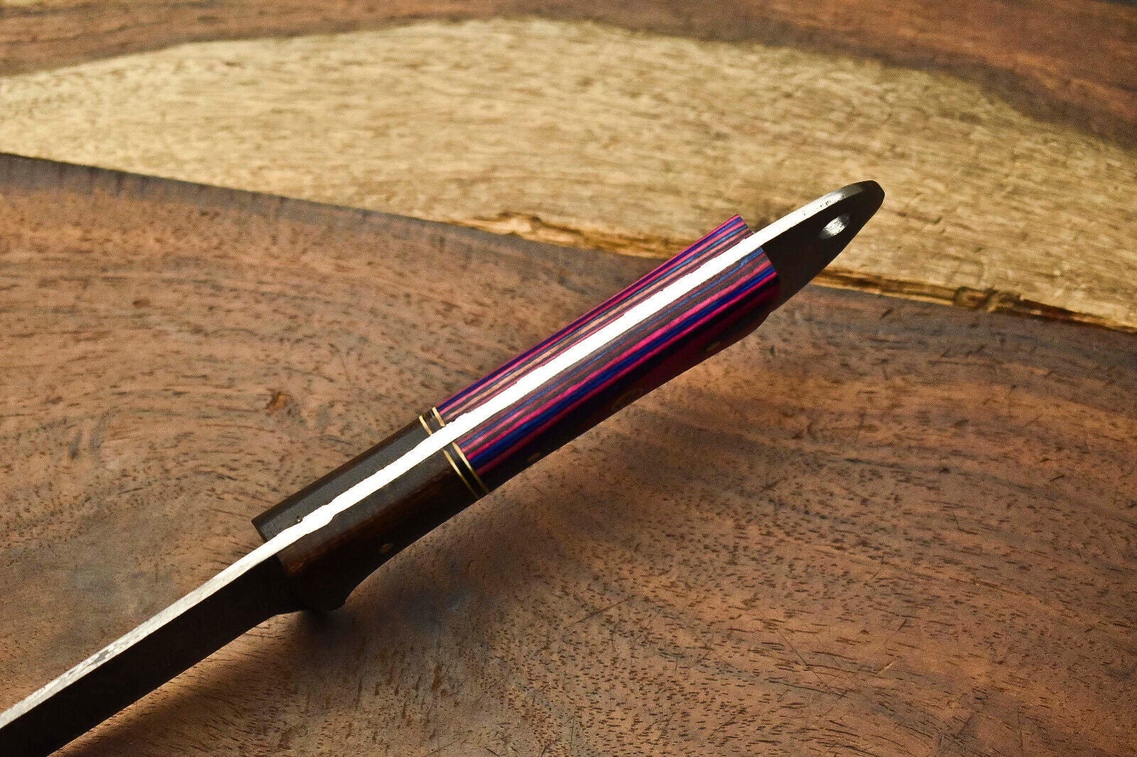 This custom handmade Damascus steel blade chef knife is expertly designed for both kitchen and outdoor performance. With an overall length of 12.0 inches, a 7.0-inch blade, and a 5.0-inch handle, this full tang knife is engineered for durability and balance. The blade is oil tempered to a Rockwell hardness of 58–60 HRC and sharpened to a precise 20-degree angle for superior cutting performance. Made from a real 384-layer blend of 1095 high carbon steel and 15N20 nickel carbon steel, the blade features an authentic Damascus pattern—not a fake acid etch. The steel layers are forged, folded, and burned in acid to expose the natural contrast between the metals, resulting in a stunning, functional work of art. The knife is then high polished, sharpening the edge and giving the surface a smooth satin finish. Each knife is completely handcrafted without the use of CNC machinery, making every piece truly one-of-a-kind. Perfect for chefs, hunters, collectors, or anyone who appreciates high-quality craftsmanship, this Damascus chef knife is a versatile tool built to last.