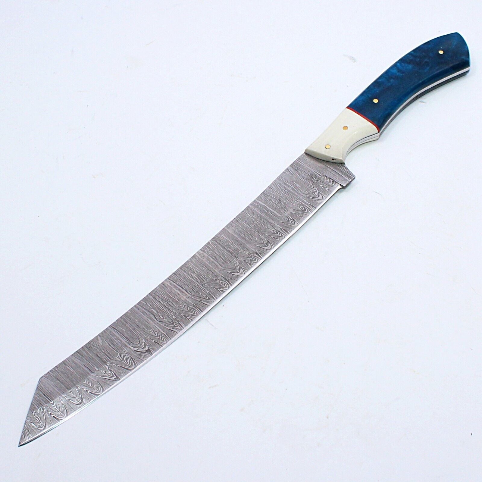 This 14-inch custom handmade Twist Damascus steel brisket fillet chef hunting knife is a true masterpiece for collectors, chefs, and outdoor enthusiasts. The knife features a 9-inch razor-sharp blade crafted in an elegant Twist Damascus pattern, hardened to 57–60 HRC to ensure exceptional edge retention and durability. Each blade is hand-forged, making every knife unique, with patterns that may vary slightly due to the natural forging process. The full tang construction provides superior strength and balance, while the custom design makes it suitable for hunting, filleting, brisket slicing, and professional chef use. The knife comes with a premium handmade leather sheath for safe carrying and storage. Our Damascus steel blades are tested to offer outstanding toughness, strength against lateral stress, and long-lasting sharpness, averaging close to 58 on the Rockwell scale—ensuring the perfect balance between strength and performance. Please note that patterns will vary as this is a fully handmade Damascus product.