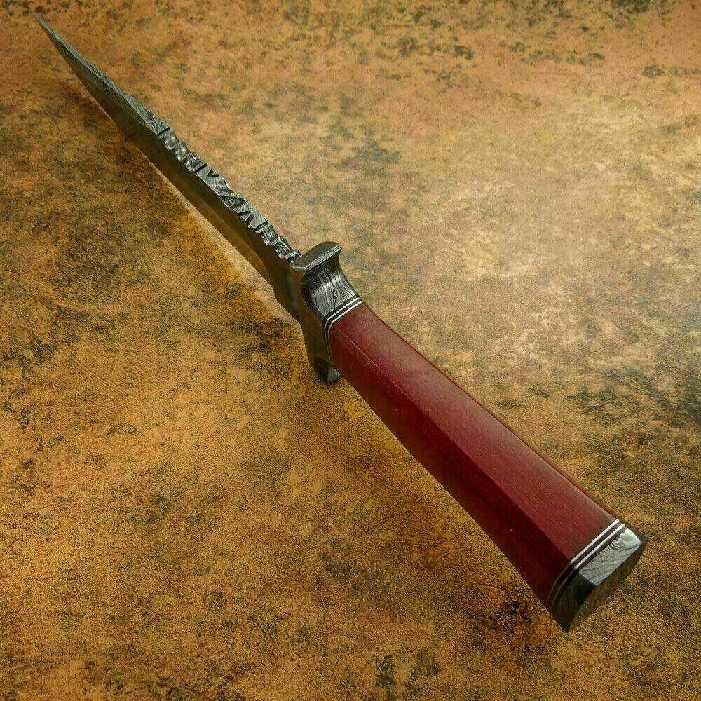 This 14 inch Damascus steel Bowie hunting knife is a rare handcrafted masterpiece built for both rugged utility and refined craftsmanship. Forged for serious outdoorsmen and collectors alike, this knife is the perfect fusion of power and precision.