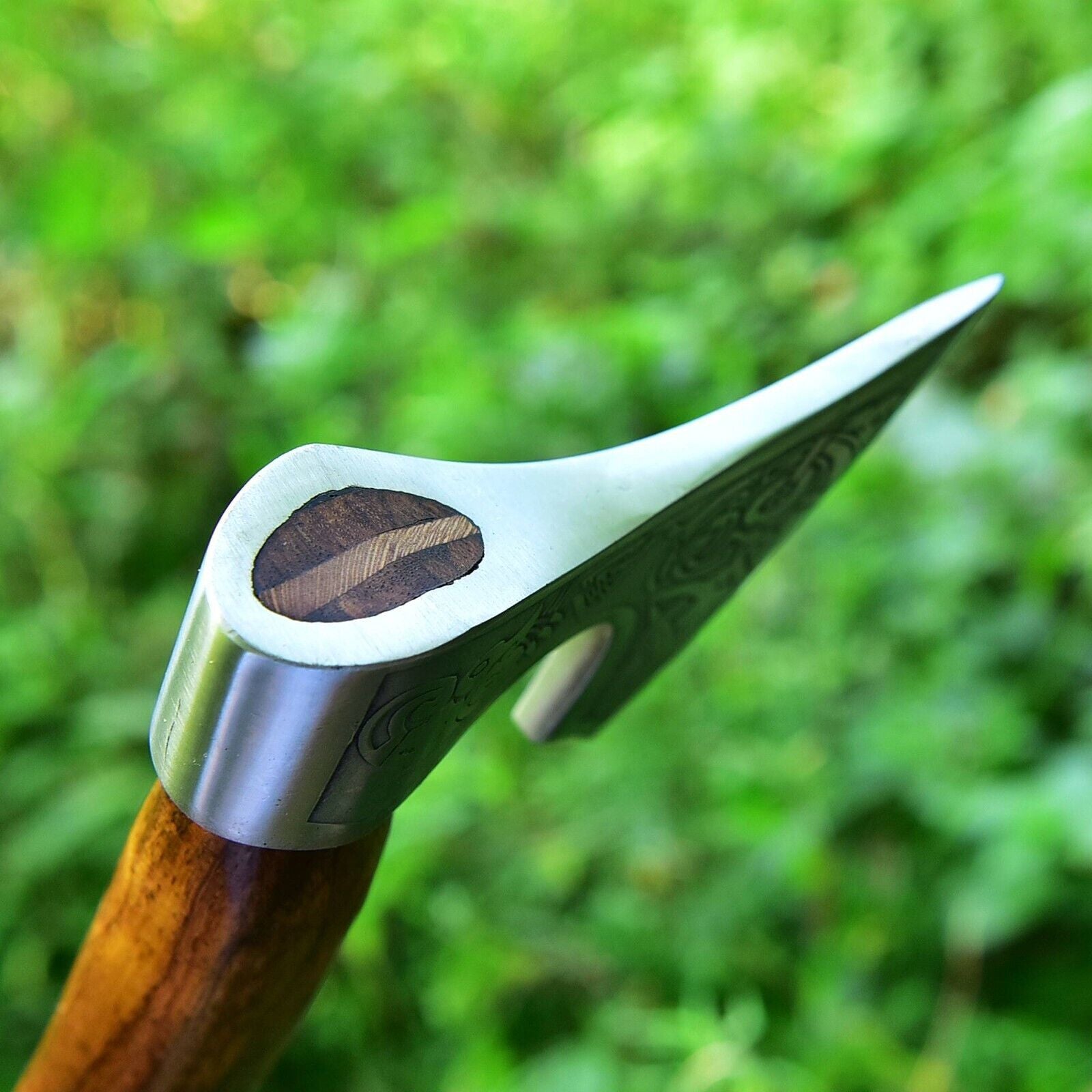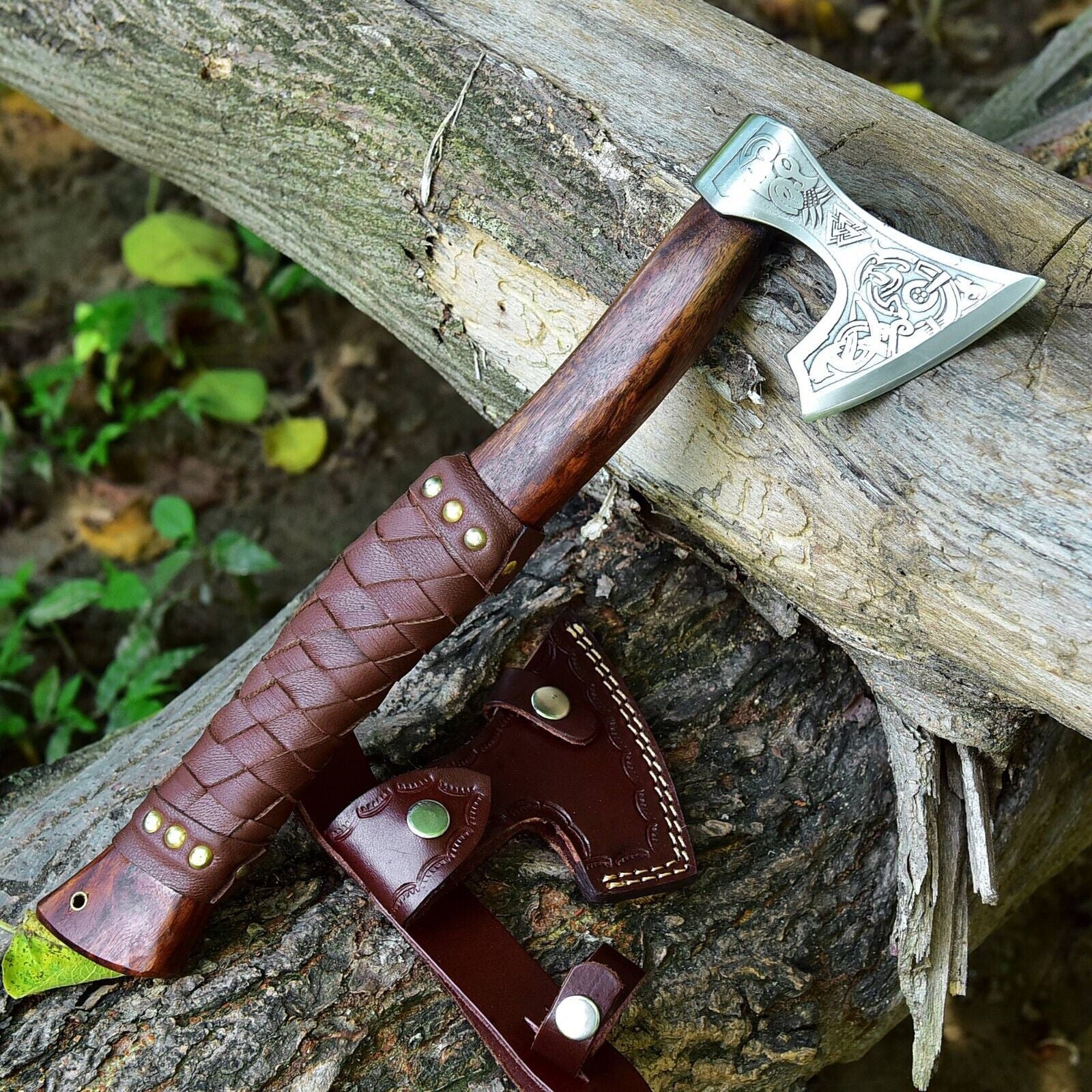 Forged with precision and built for strength, this handmade Viking tomahawk is crafted from 1095 high carbon steel, delivering exceptional durability and cutting power. With an overall length of 14 inches, a 3.5-inch cutting edge, and a 4.5-inch head length, this hatchet strikes the perfect balance between function and tradition. The axe blade undergoes expert heat treatment, achieving a Rockwell hardness of 54 HRC along the edge and 42–45 HRC along the spine, ensuring resilience for repeated heavy use. Its 4 mm thick blade is beautifully ground by hand, with a clean false edge along the top for added character. The handle is crafted from premium rosewood, offering both durability and a natural aesthetic, while the included fine leather sheath ensures safe storage and easy portability. Compact yet powerful, this tomahawk is a versatile tool for camping, bushcraft, hunting, wood cutting, or combat training. Whether you’re a collector of Viking weapons, an outdoorsman seeking a reliable working axe, or looking for a unique gift, this hand forged carbon steel hatchet blends authentic craftsmanship with modern performance and is built to last generations.