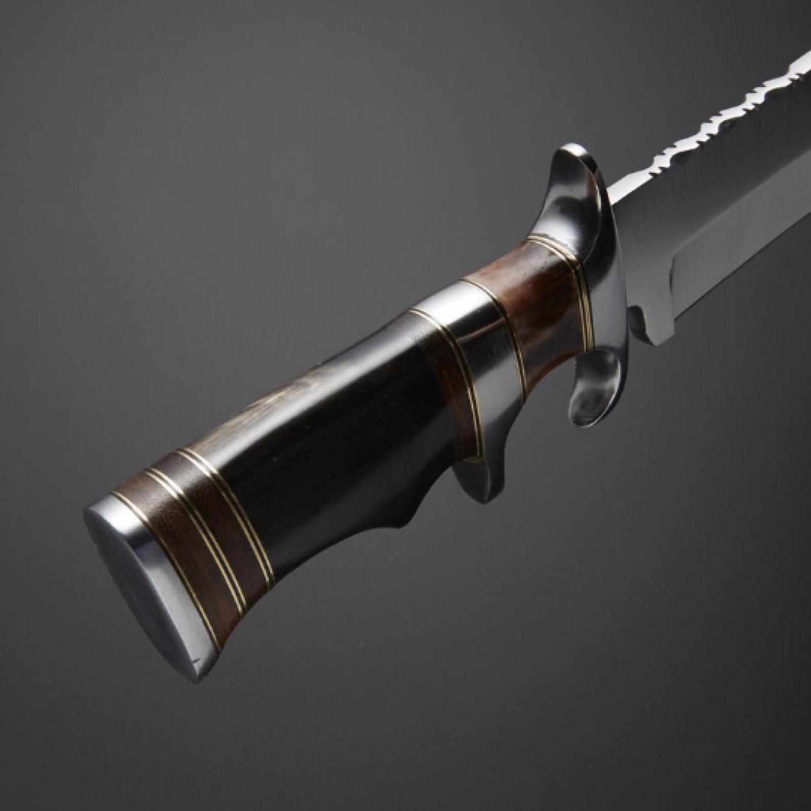 This 14 inch handmade D2 steel hunting bowie knife is a powerful and durable tool built for serious outdoor use. Forged from high-quality D2 tool steel, the 9-inch fixed blade offers excellent edge retention, wear resistance, and cutting performance—perfect for camping, survival, hunting, and bushcraft. The blade has a hardness rating of 55-58 HRC, ensuring long-lasting sharpness in demanding conditions.