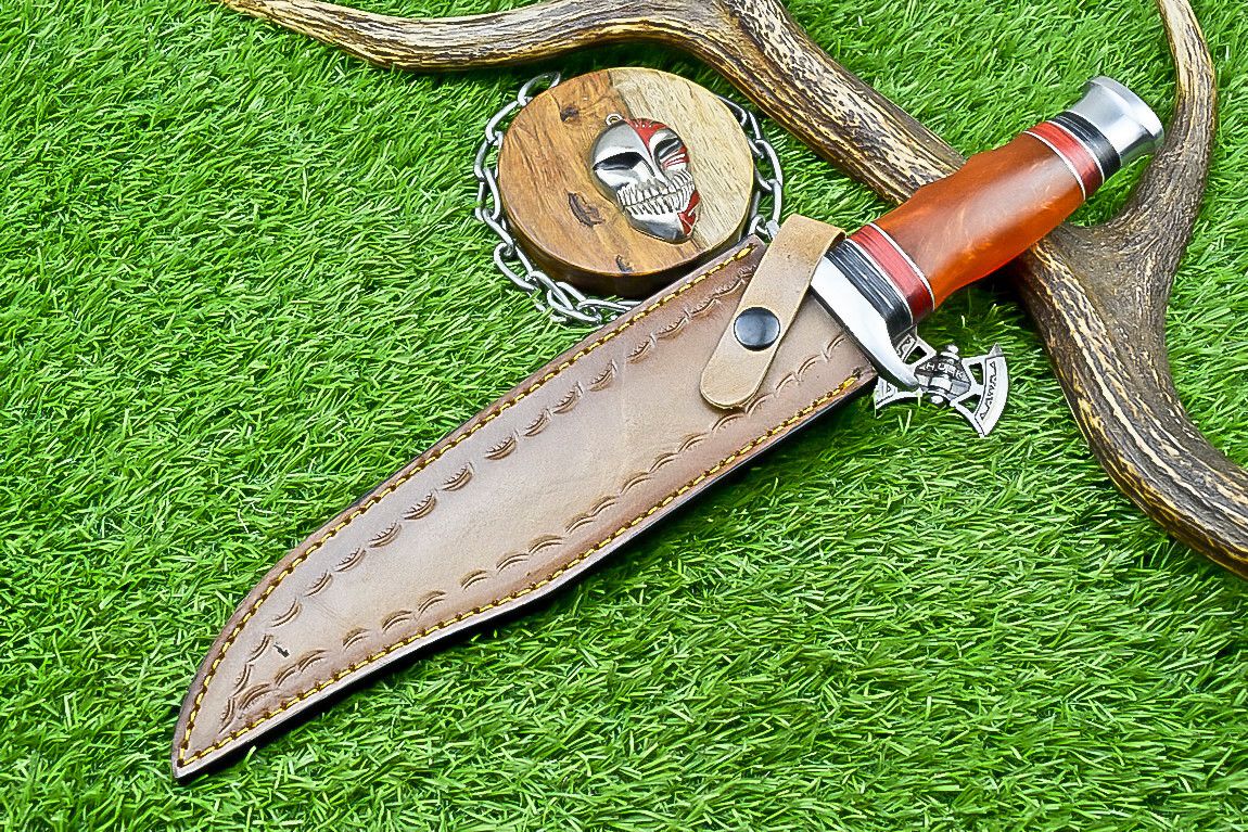 14" Premium Damascus Bowie Knife – Camel Bone & Resin Handle with Leather Sheath