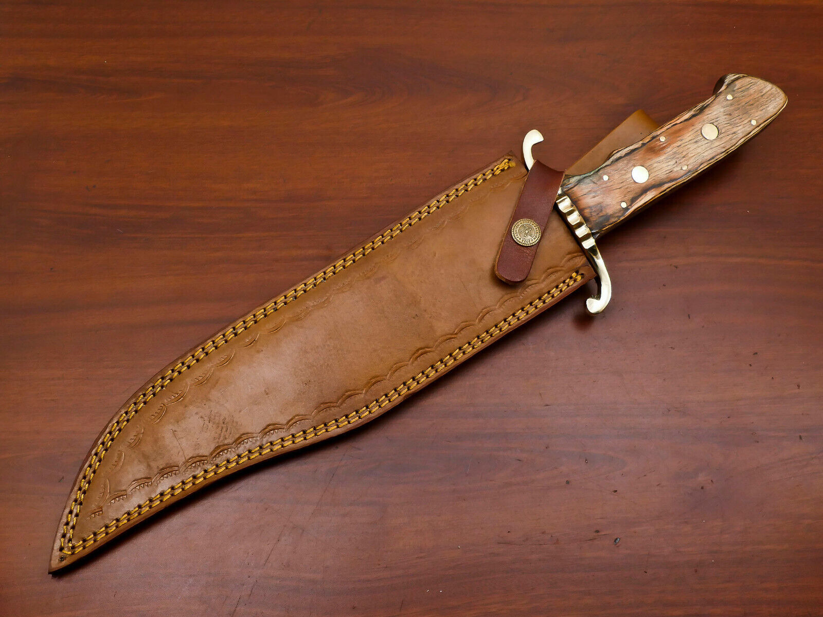 The Pakka wood handle, secured with brass pins and industrial epoxy, adds durability and aesthetic beauty, while the hand-casted brass guard enhances safety and traditional charm. A custom-fit premium leather sheath made of genuine calfskin is included, hand-tooled to complement the knife’s bespoke quality.