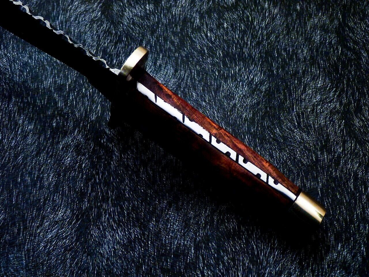 Its striking 5" natural wood handle is secured with strong epoxy and a mosaic pin, finished with a hand-cast brass bolster that adds both strength and elegance. Filework on the spine enhances the artisanal detail, making it a display-worthy knife that performs just as beautifully.
