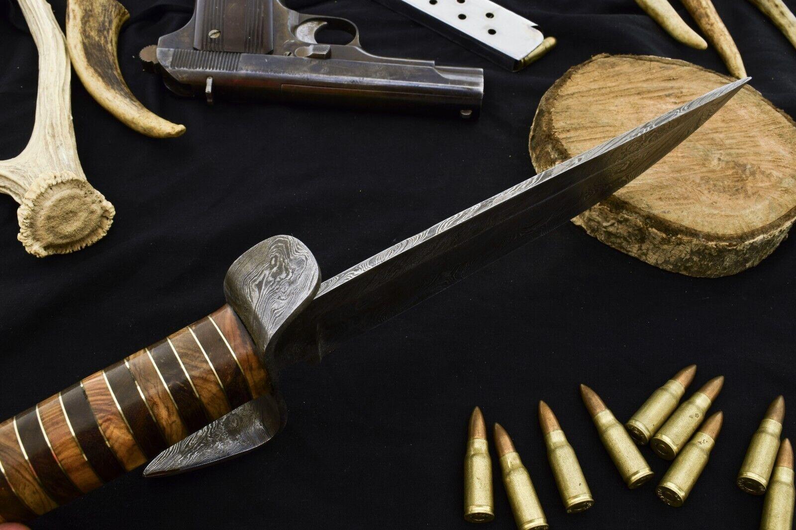 15" Damascus Steel Bowie Knife with Wood Handle & Damascus Guard