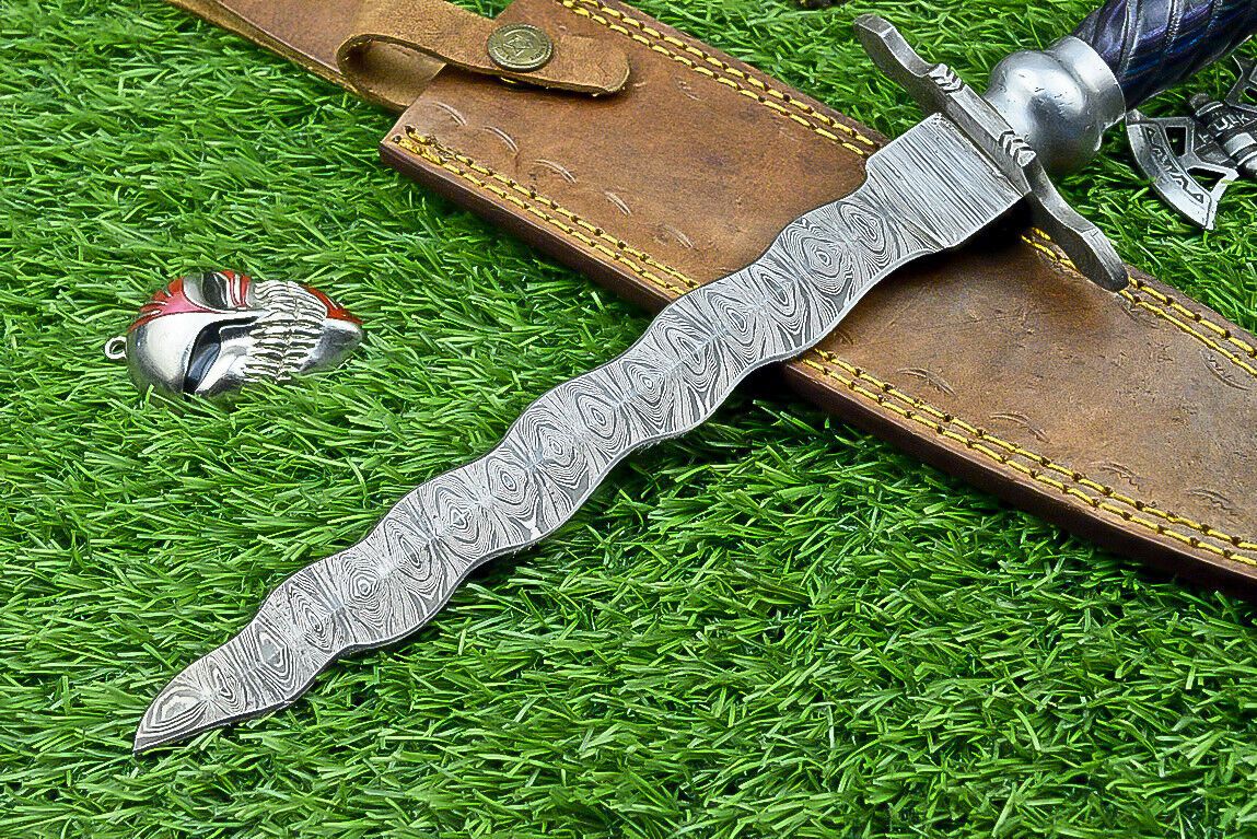 Each piece includes a premium leather sheath, hand-stitched for durability and protection. Whether for display or field use, this hand-forged Damascus dagger embodies strength, precision, and tradition—all under the craftsmanship of Heritage Forge.
